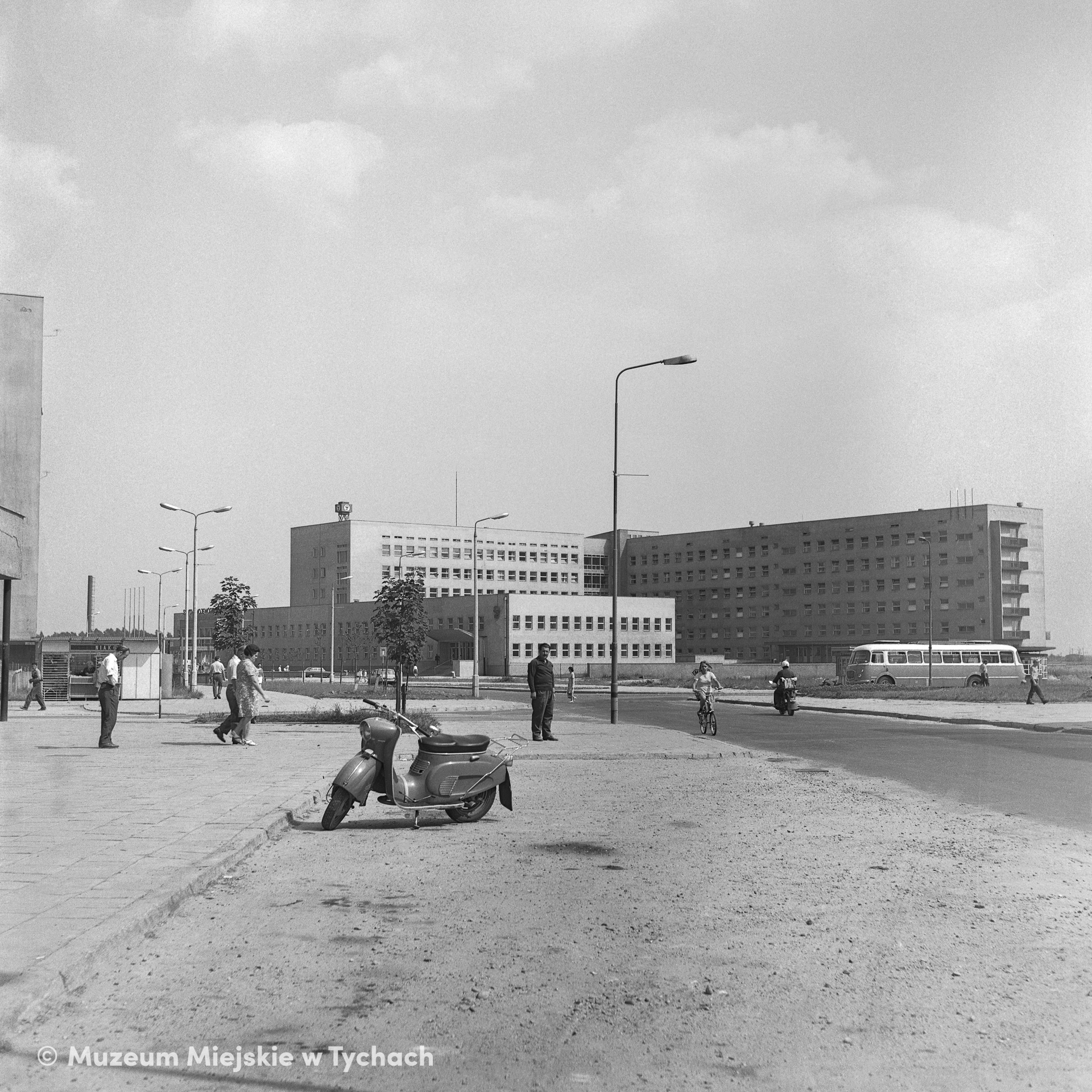 Widok na budynki Wojewódzkiego Szpitala Specjalistycznego w Tychach (obecnie Wojewódzki Szpital Specjalistyczny Megrez Sp. z o.o.) oraz skrzyżowanie ulic Małgorzaty Fornalskiej (obecnie kardynała Stefana Wyszyńskiego) i Fryderyka Engelsa (obecnie Edukacji).