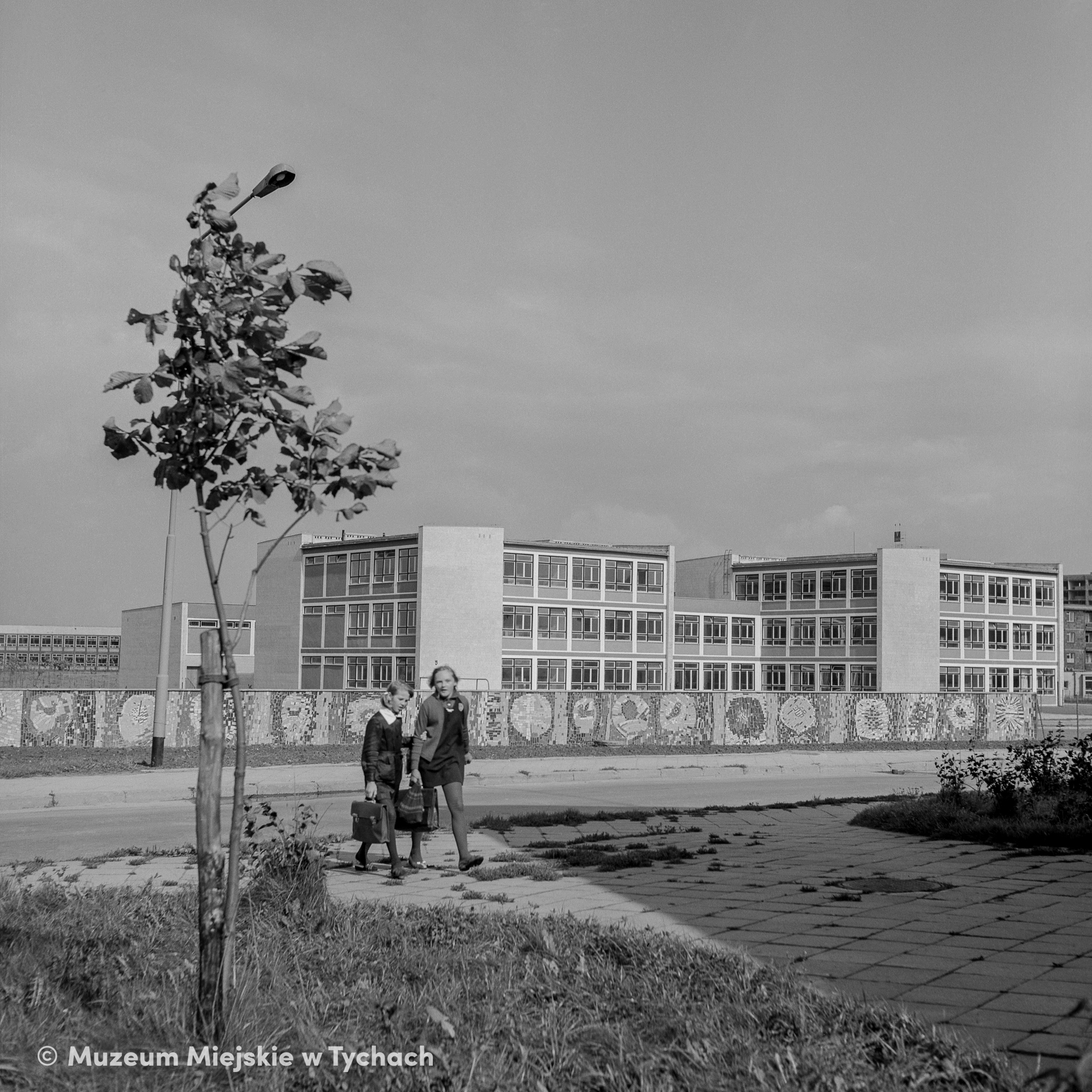 Dwie uczennice w drodze powrotnej ze szkoły, za dziewczynkami budynek Szkoły Podstawowej nr 18 im. Władysława Jagiełły. Na jego ogrodzeniu znajduje się mozaika z kolistymi kompozycjami abstrakcyjnymi i zgeometryzowanymi formami ptaków, zaprojektowana i wykonana przez Franciszka Wyleżucha.