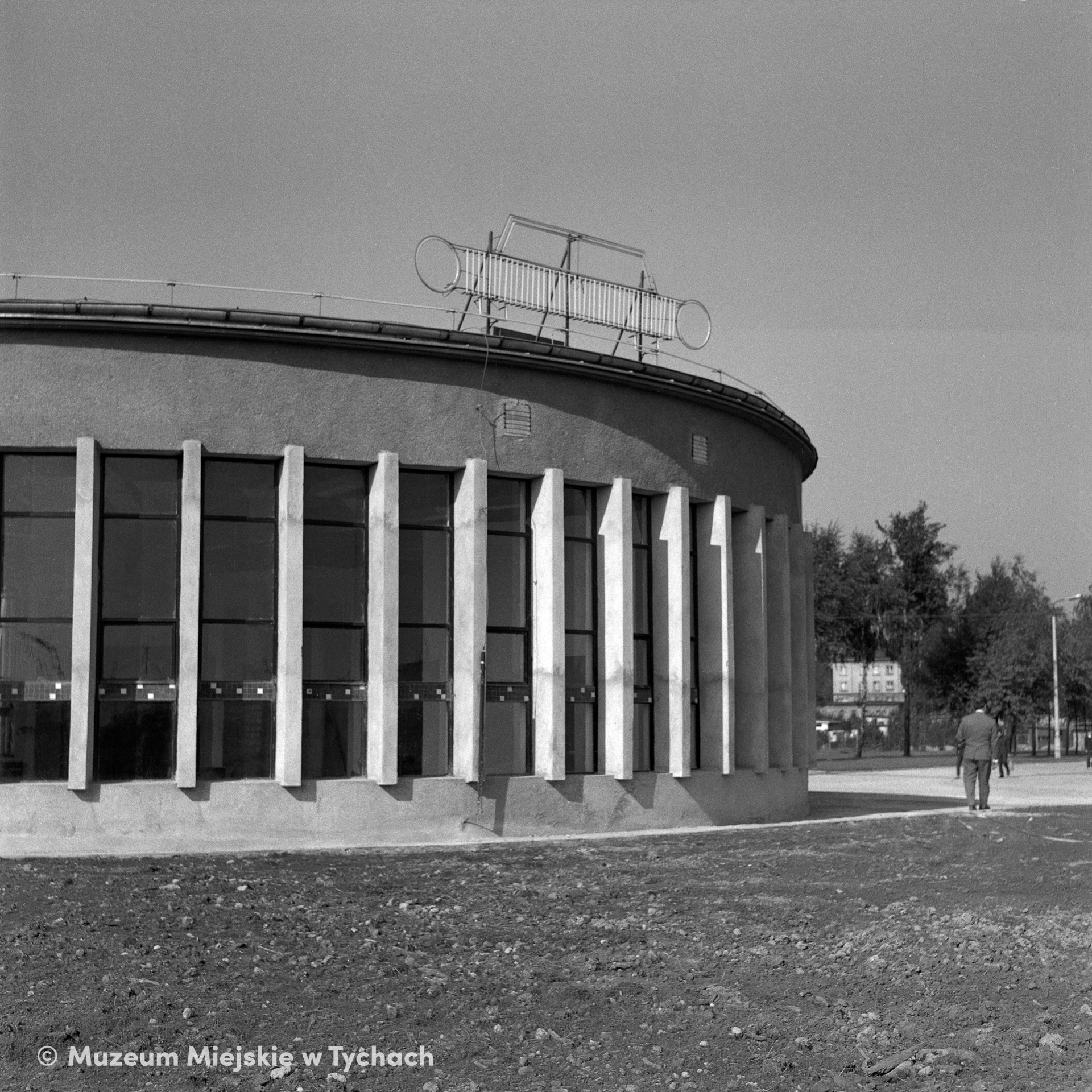 Fragment Stacji Diagnostycznej ośrodka szkoleniowego pod nazwą Zakład Doskonalenia Zawodowego w Tychach. Na budynku neon przedstawiający samochód.