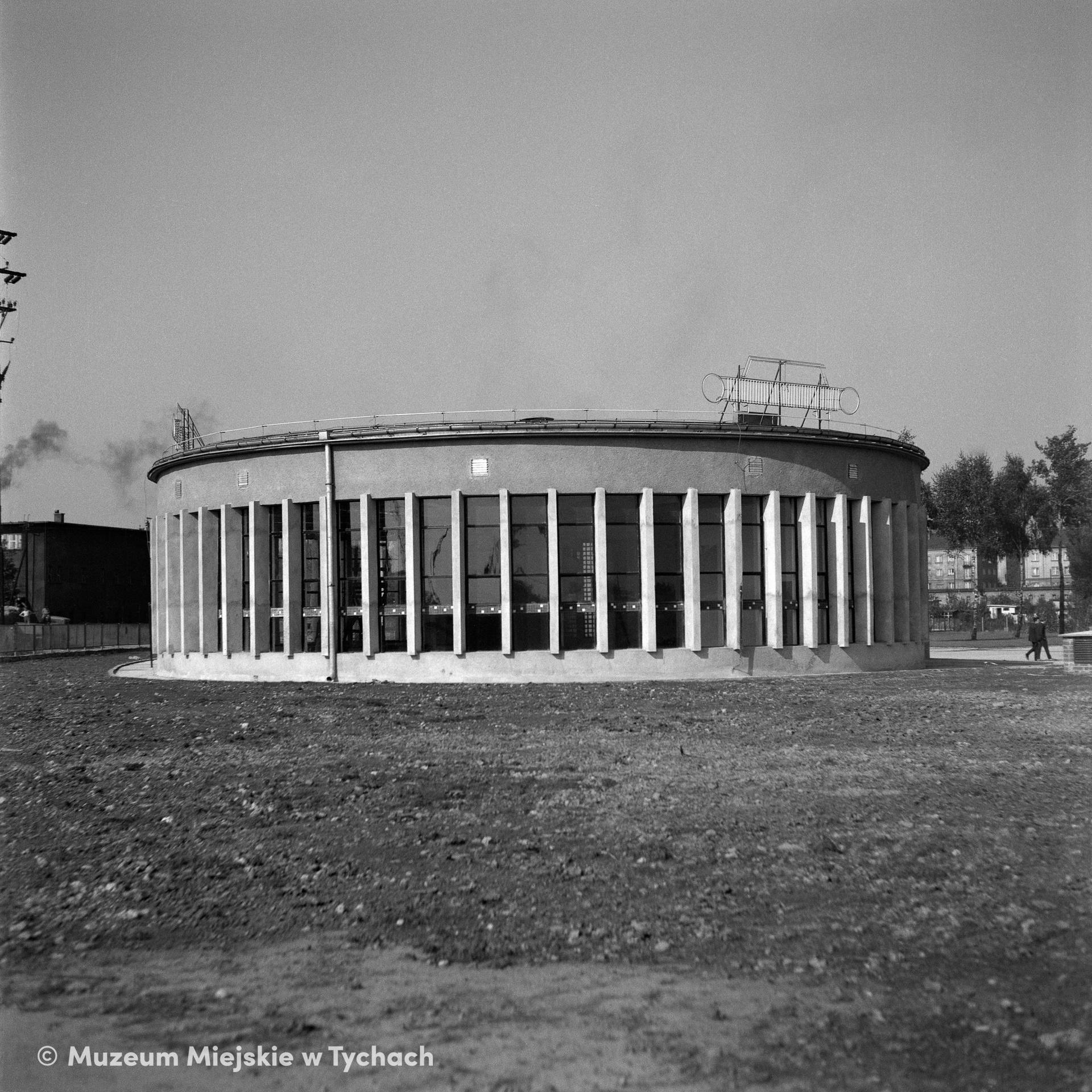 Widok na Stację Diagnostyczną ośrodka szkoleniowego pod nazwą Zakład Doskonalenia Zawodowego w Tychach. Na budynku neon przedstawiający samochód.