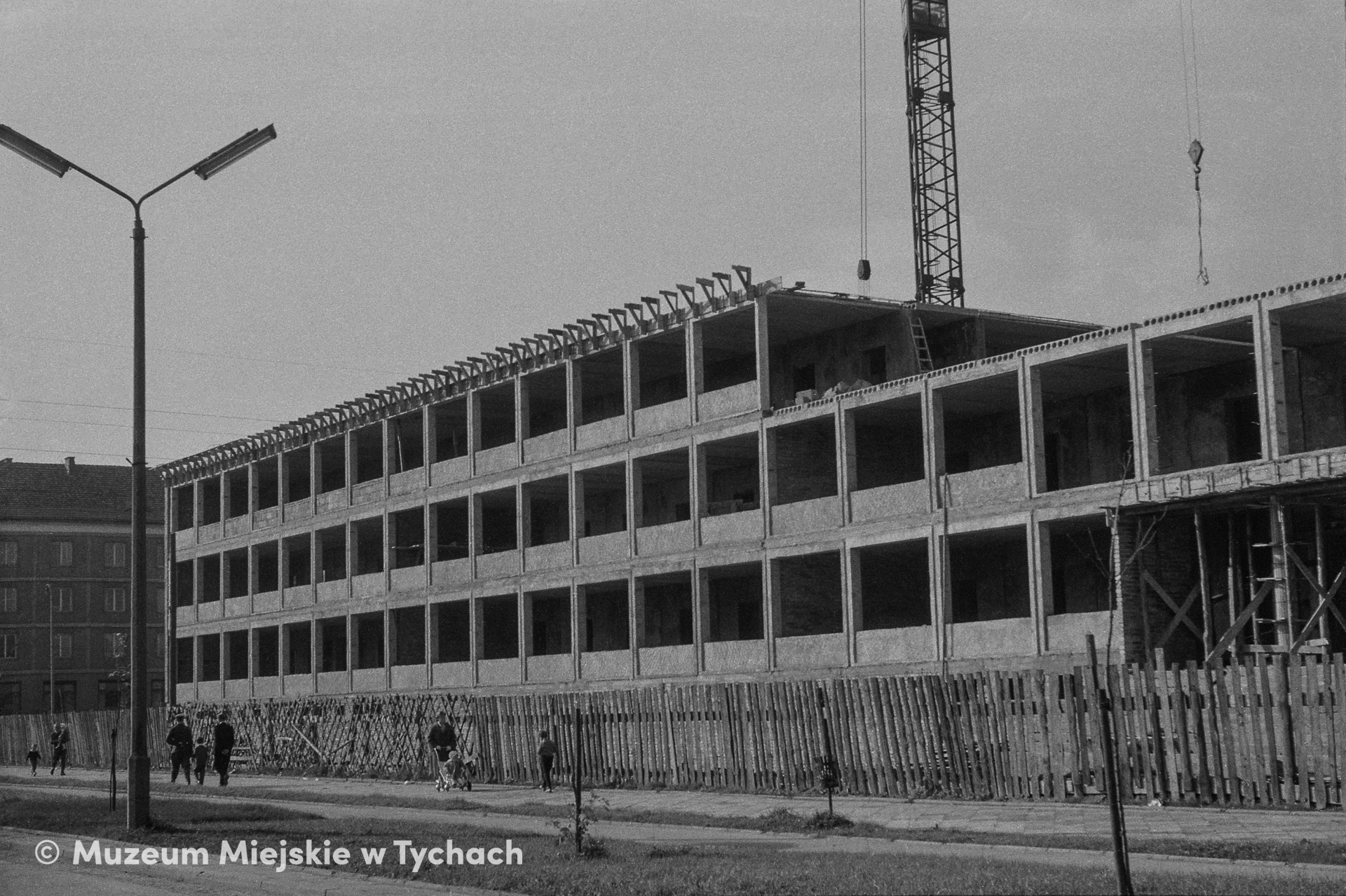 Widok od frontu budynku głównego na budowę Komendy Powiatowej Milicji Obywatelskiej przy alei Bielskiej. Obecnie wewnątrz budynku mieści się siedziba Komendy Miejskiej Policji.