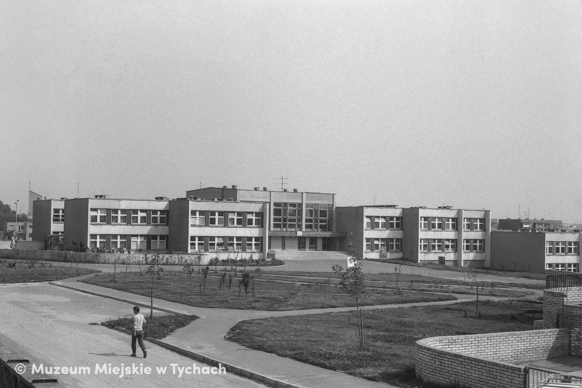Widok od zachodu, od ulicy Lwa Tołstoja, na wejście do głównego budynku Szkoły Podstawowej nr 7. Szkoła złożona z wielokondygnacyjnych segmentów o różnym przeznaczeniu. Zaraz przy wejściu znajduje się amfiteatralny hol główny, łączący parter i piętro, wykorzystywany m.in. do organizowania akademii szkolnych. Teren szkoły ogrodzono ściankami z cegły i metalowymi balustradami.