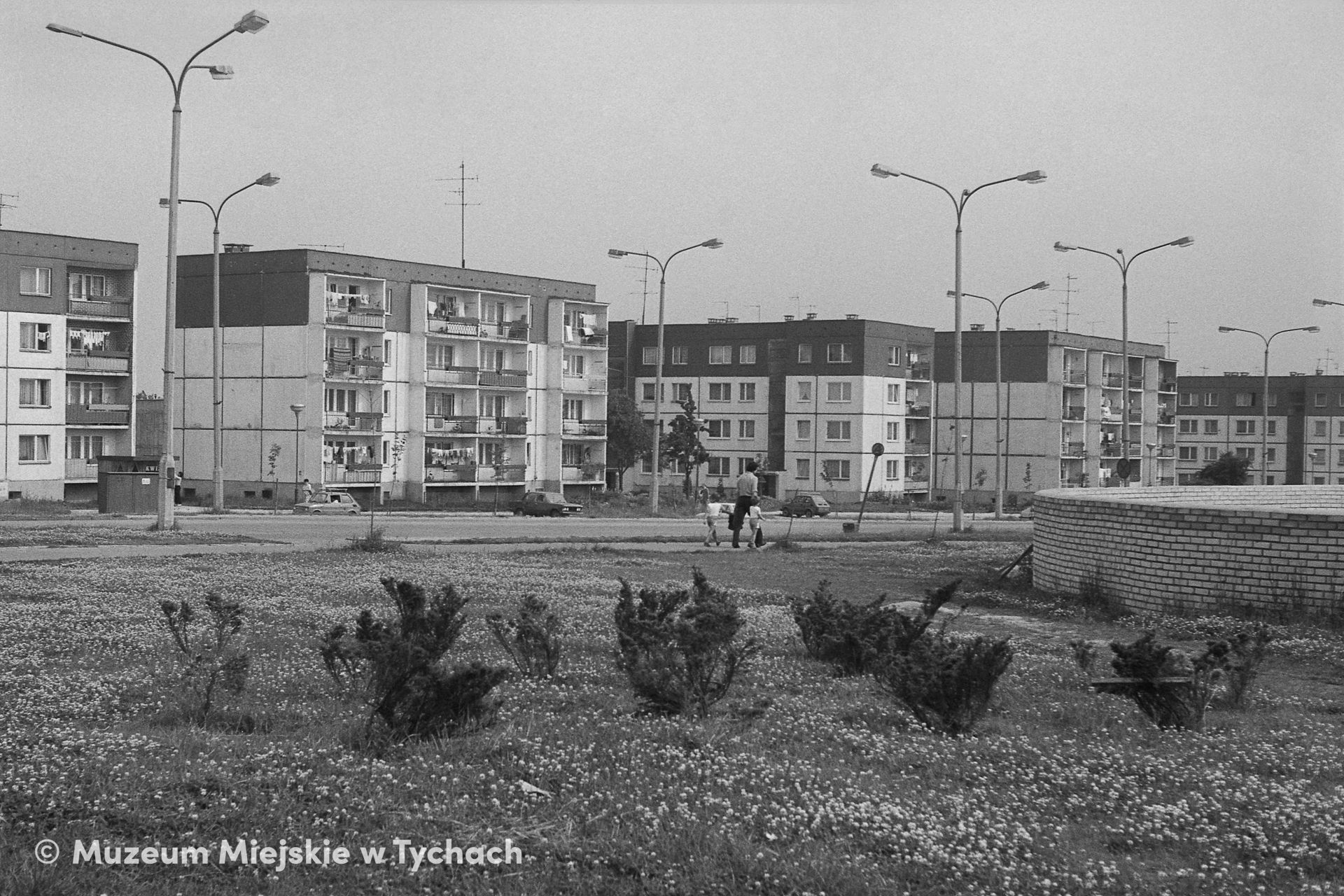 Czteropiętrowe budynki mieszkalne na osiedlu T oraz fragment ulicy Iwana Koniewa (obecnie Armii Krajowej). Przed budynkami zaparkowane nieliczne samochody osobowe. Widok spod Szkoły Podstawowej nr 7, położonej po przeciwległej stronie ulicy.