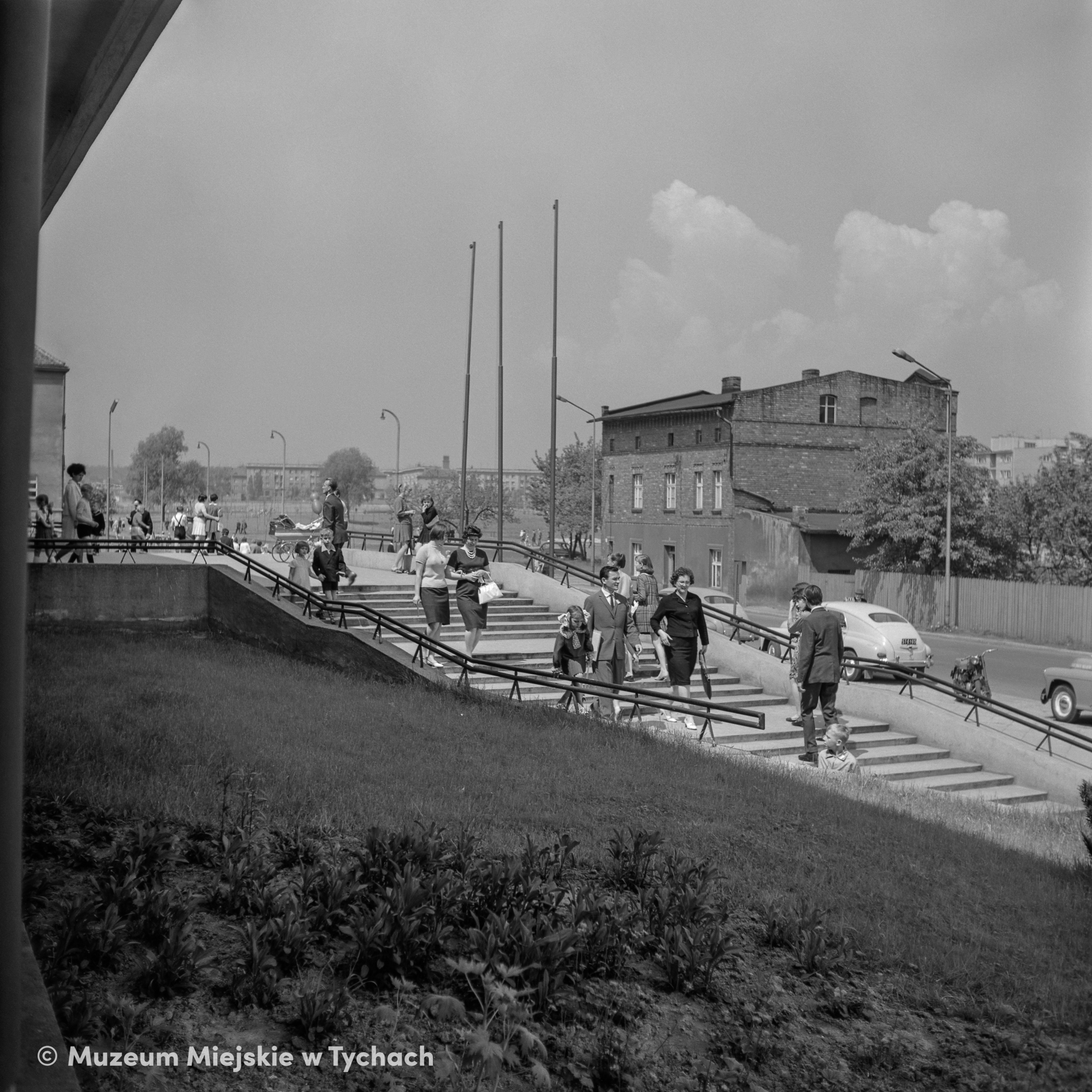 Tyszanie na schodach prowadzących do Teatru Małego. Z prawej strony stary jednorodzinny dom mieszkalny. Zdjęcie wykonane podczas kiermaszu z okazji Dni Oświaty, Książki i Prasy.