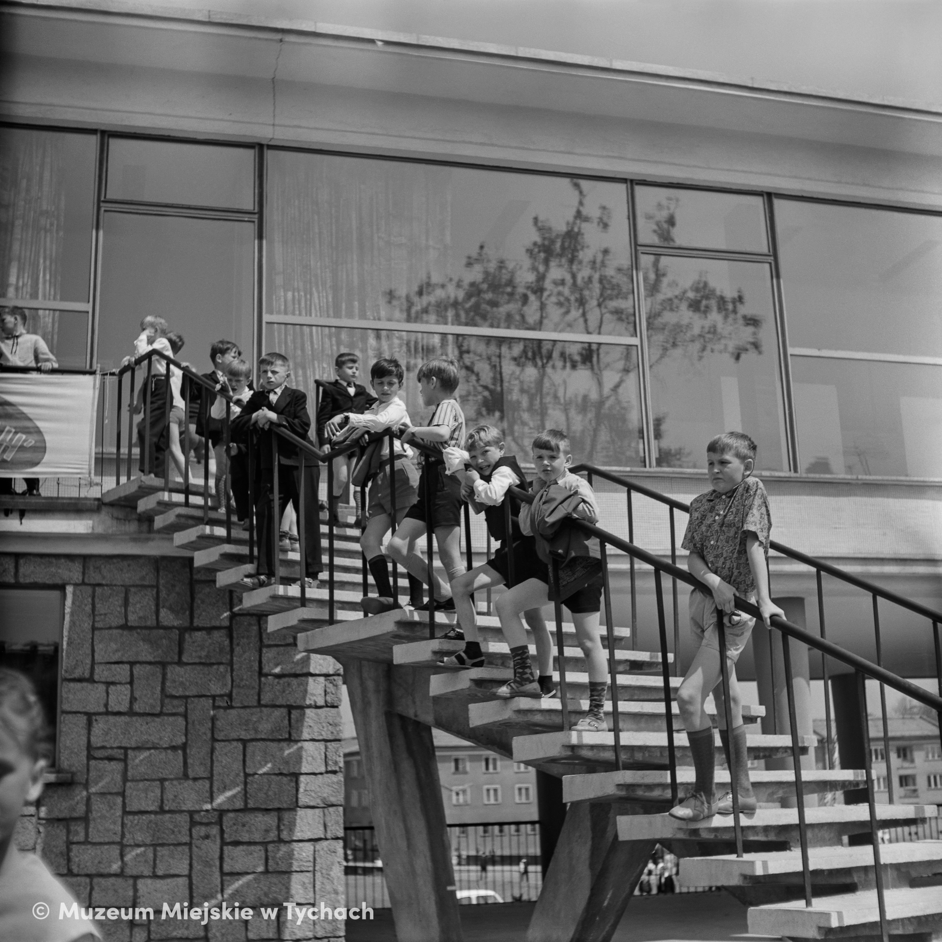 Dzieci na schodach do budynku Teatru Małego podczas kiermaszu z okazji Dni Oświaty, Książki i Prasy. Autorami koncepcji budynku są Wacław Jaciow, Bolesław Seredyński i Kazimierz Wejchert, autorem zrealizowanego projektu – Wacław Jaciow.