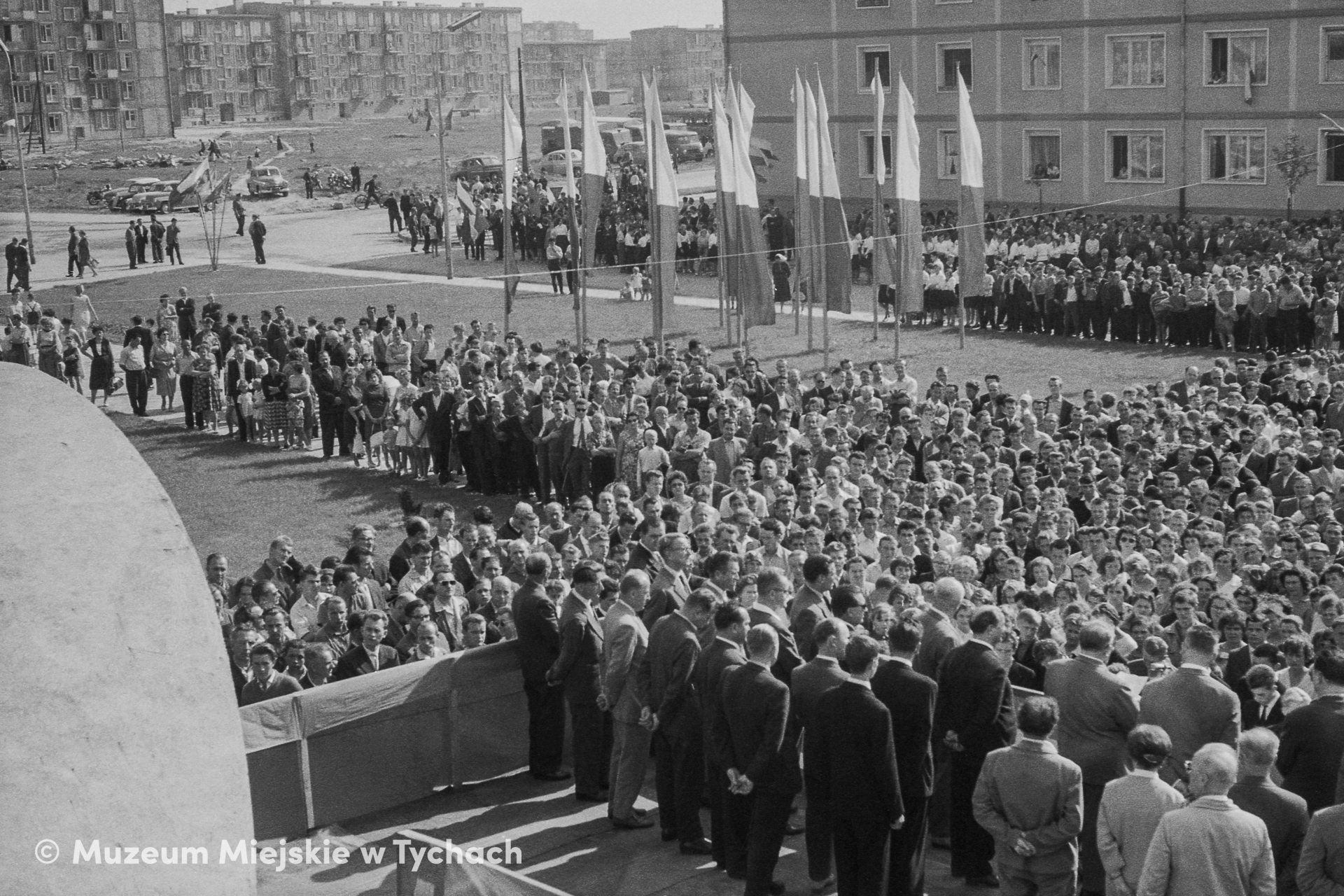 Uroczyste otwarcie Technikum Budowlanego i Szkoły Rzemiosł Budowlanych im. Stefana Franciszaka (obecnie Zespół Szkół nr 5 w Tychach). Widok sprzed budynku szkoły na gości i mieszkańców zgromadzonych przed głównym wejściem.