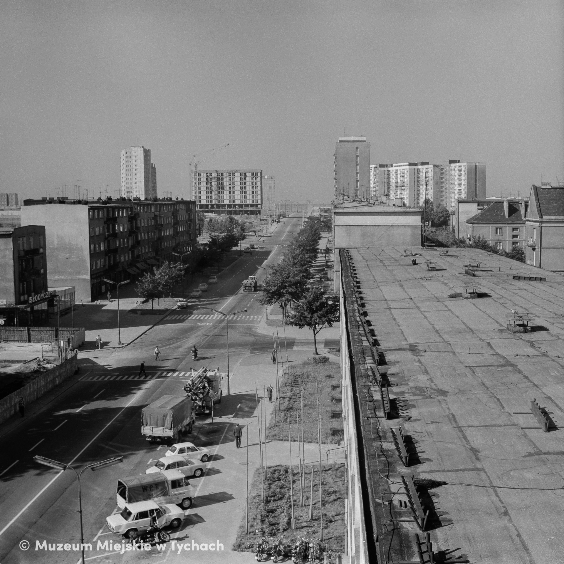 Widok z góry na ulicę Feliksa Dzierżyńskiego (obecnie gen. Stefana Grota Roweckiego). Po prawej stronie fragment osiedla C, w oddali osiedle M. Po lewej frament osiedla D, w oddali Hotel Tychy w trakcie budowy oraz osiedle N.