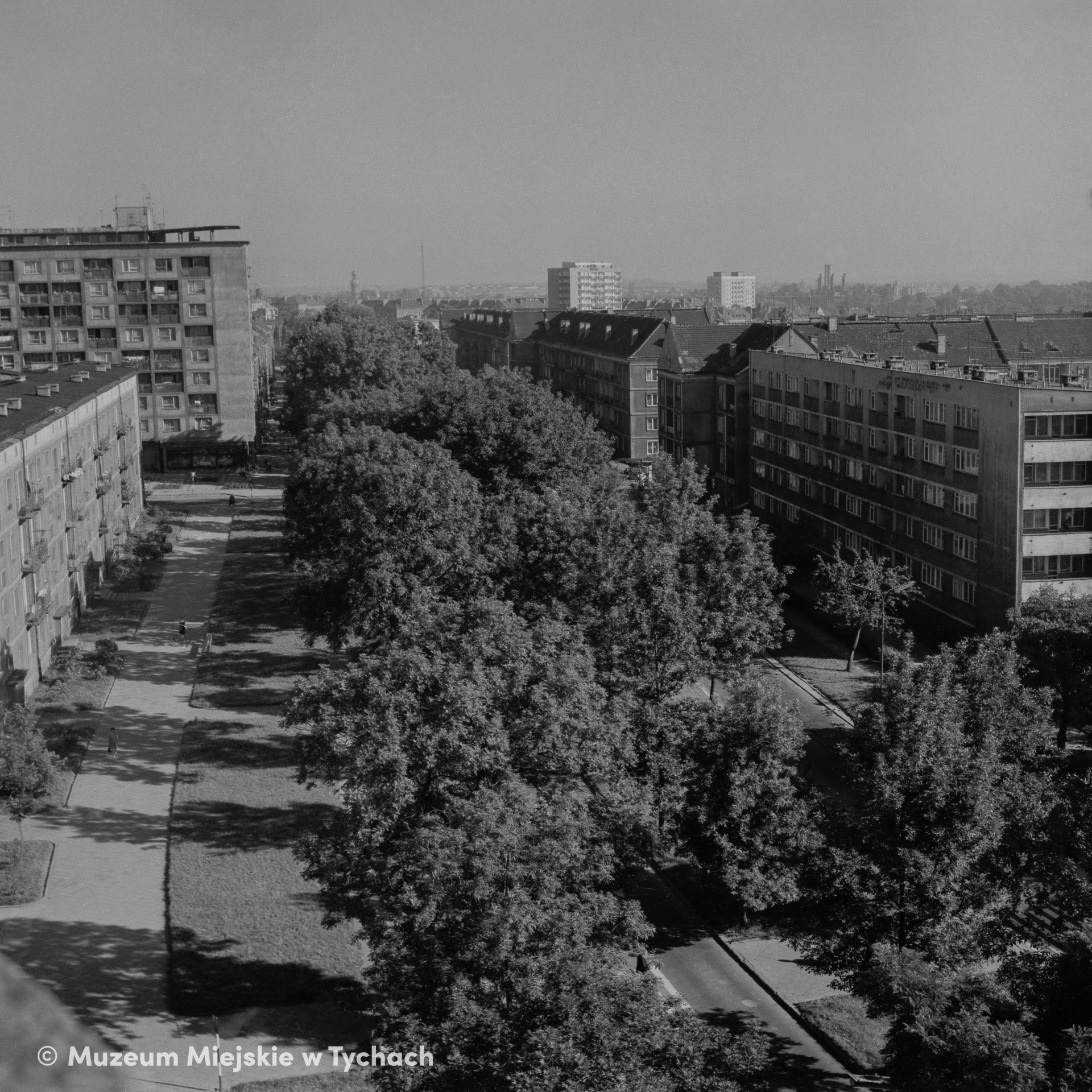 Widok z góry na ukrytą między drzewami ulicę Paprocańską (od 1968 do 1989 roku aleję Rewolucji Październikowej, obecnie aleję Niepodległości). Po prawej stronie fragment osiedla E, po lewej osiedle C z pierwszym wieżowcem w Tychach, nazywanym przez mieszkańców „Chełmkiem” od sklepu obuwniczego, który mieścił się na parterze budynku.