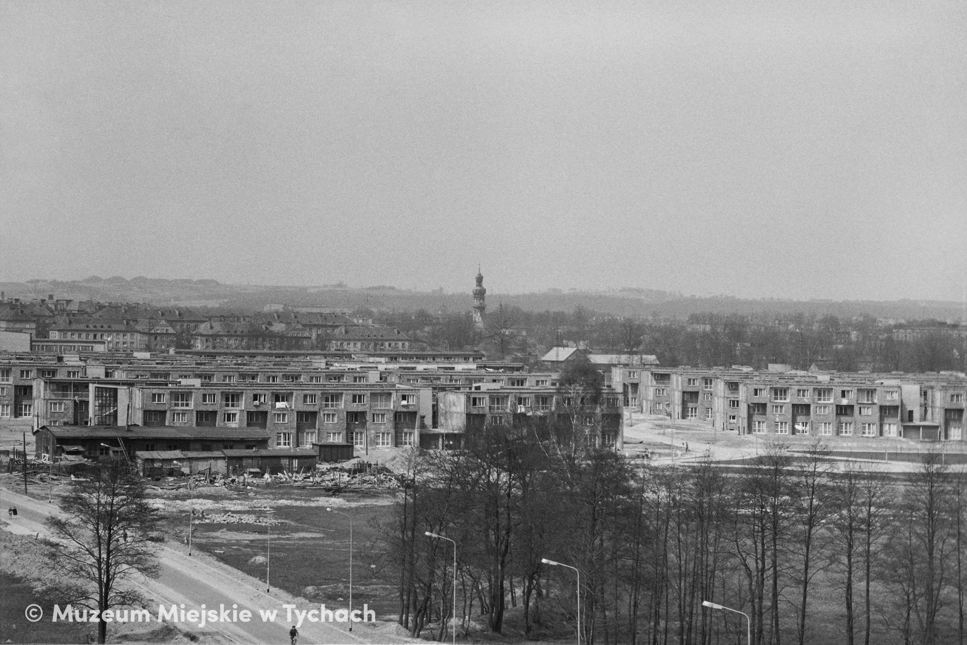 Fragment parku i nieotynkowana, ale oddana do użytku zabudowa szeregowo-galeriowa w okolicy ulic Fryderyka Engelsa (obecnie Edukacji) i Elfów. wokół osiedla nieuporządkowany teren po budowie. W głębi widok na zabudowę osiedla B i wieżę kościoła św. Marii Magdaleny.