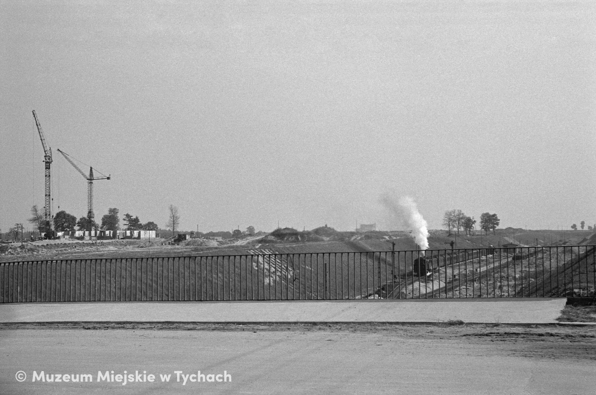Widok z wiaduktu nad wykopem w miejscu rozjazdu kolejowego i przyszłej stacji Tychy Miasto. Na torowisku wagony osobowe ciągnięte przez parowóz. Po lewej stronie wykopu trwa budowa osiedla D.