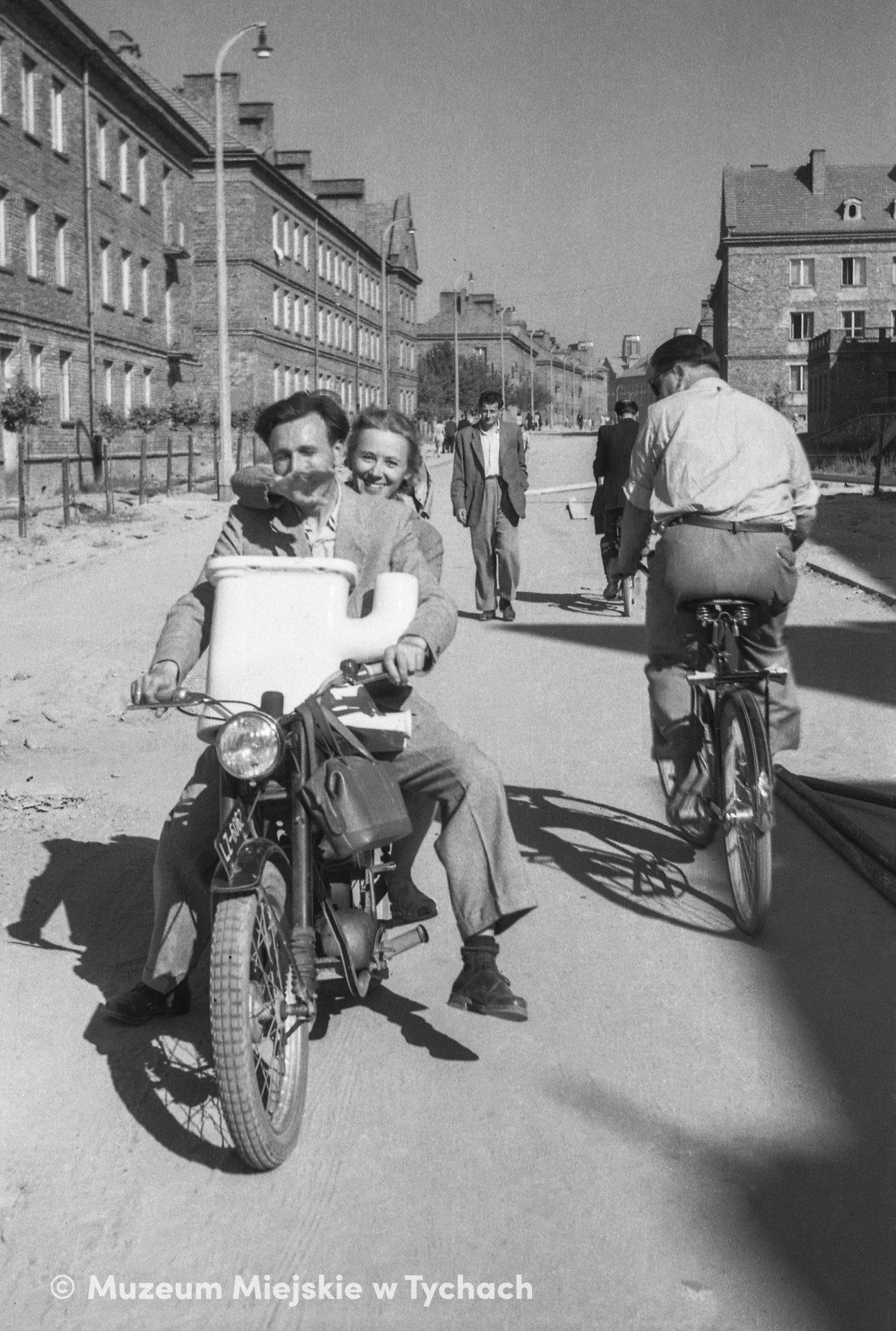 Budowlańcy przewożą motocyklem muszlę klozetową, której brakowało w oddawanym do użytku mieszkaniu przy ulicy Karola Świerczewskiego, blok 216 (obecnie bp. Juliusza Burschego). Zdjęcie wykonano w czasie przejazdu ulicą Bolesława Bieruta (obecnie Stefana Batorego). W głębi Dom Pod Wieżyczkami przy placu Bolesława Bieruta (obecnie Krzysztofa Kamila Baczyńskiego).