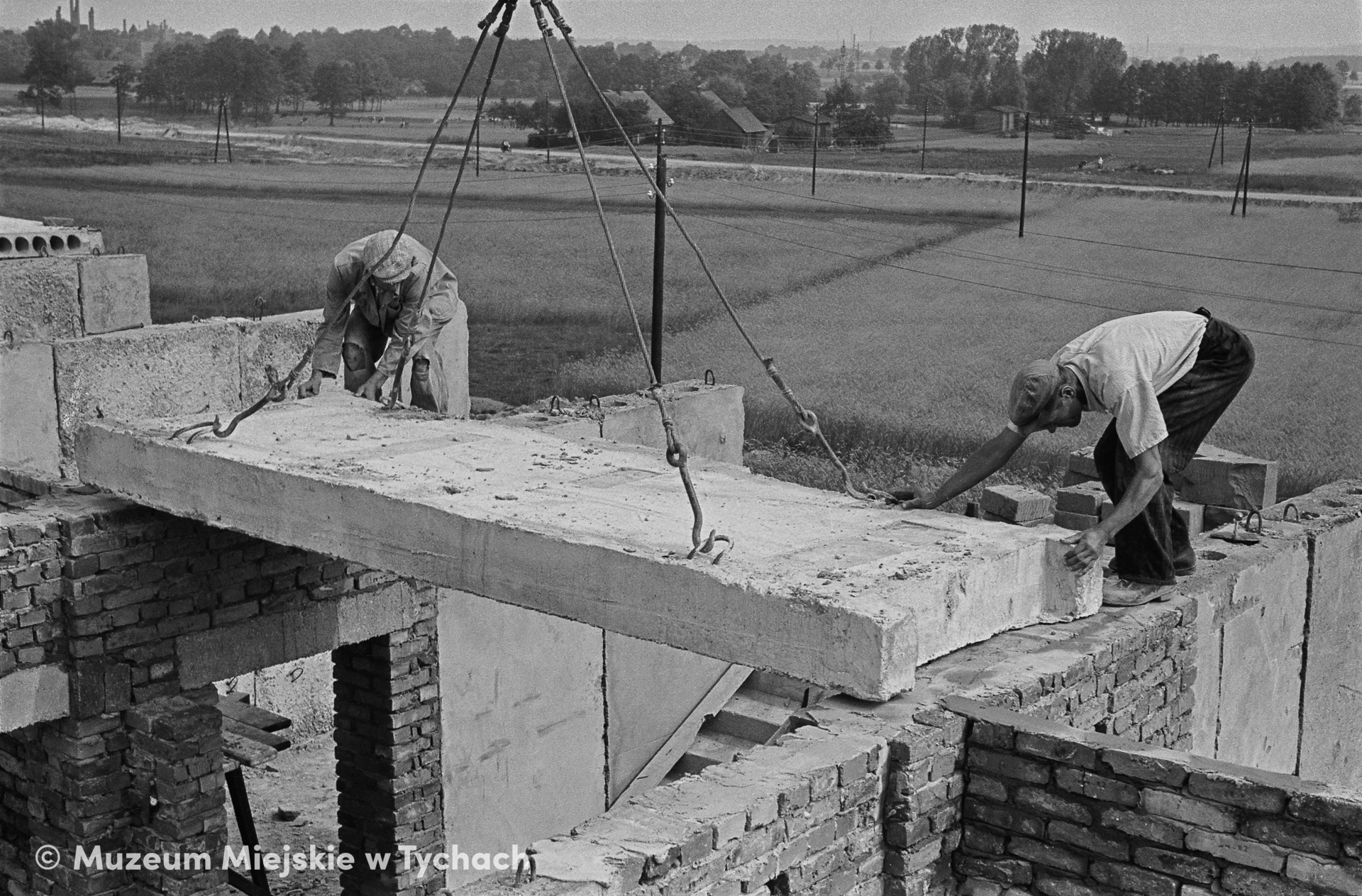 Początek budowy osiedla C. Montaż płyty stropowej na kondygnacji budowanego obiektu. W głębi widok na pola, zabudowania gospodarcze i drogę do Paprocan, teren przewidziany pod zabudowę osiedla C.