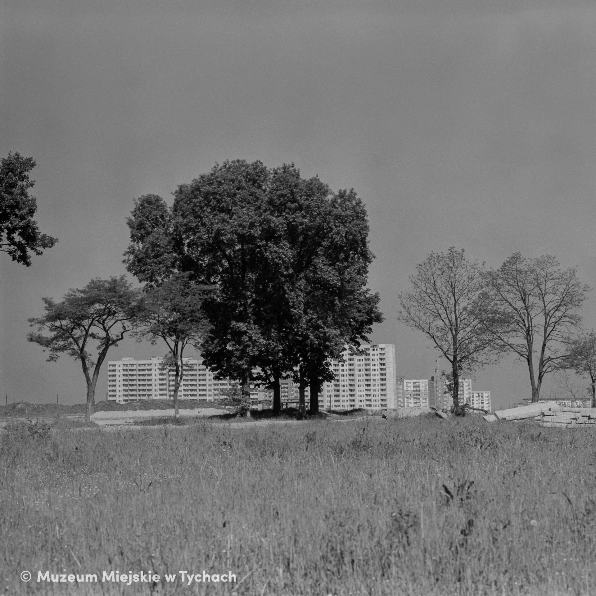 Otoczony drzewami krzyż kamienny „Boża Męka” nieopodal wykopu kolejowego. W oddali widać wielokondygnacyjne budynki mieszkalne na osiedlu N.