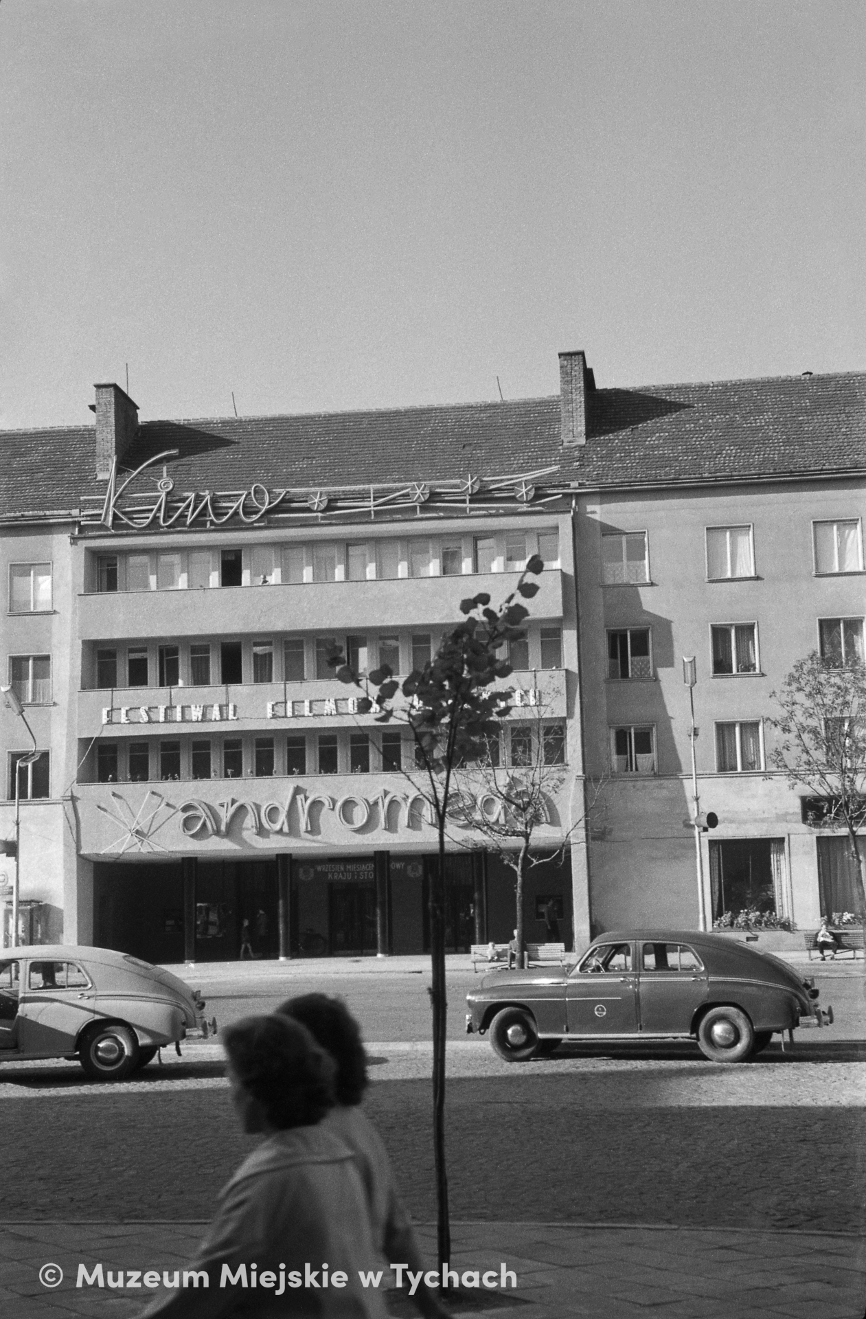 Północna pierzeja placu Bolesława Bieruta (obecnie Krzysztofa Kamila Baczyńskiego) z kinem Andromeda, kawiarnią i restauracją Mimoza. Przed budynkami zaparkowano samochody osobowe marki Warszawa. Na elewacji napis „FESTIWAL FILMÓW POLSKICH”, nad wejściem do kina widoczny transparent z hasłem „WRZESIEŃ MIESIĄCEM BUDOWY KRAJU I STOLICY”.