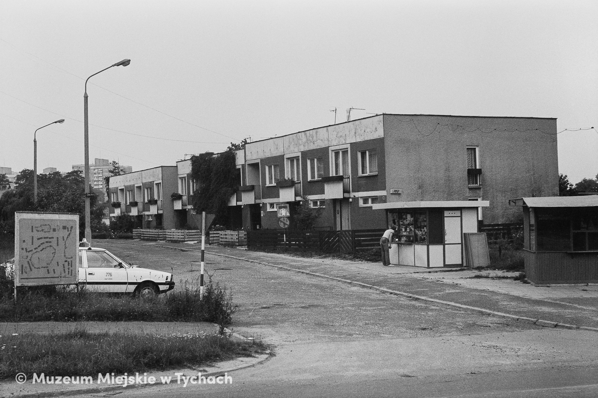 Zabudowa szeregowa przy ulicy Stefana Jaracza na osiedlu O, obok domów widać kiosk Ruchu i mały sklep z artykułami spożywczymi.