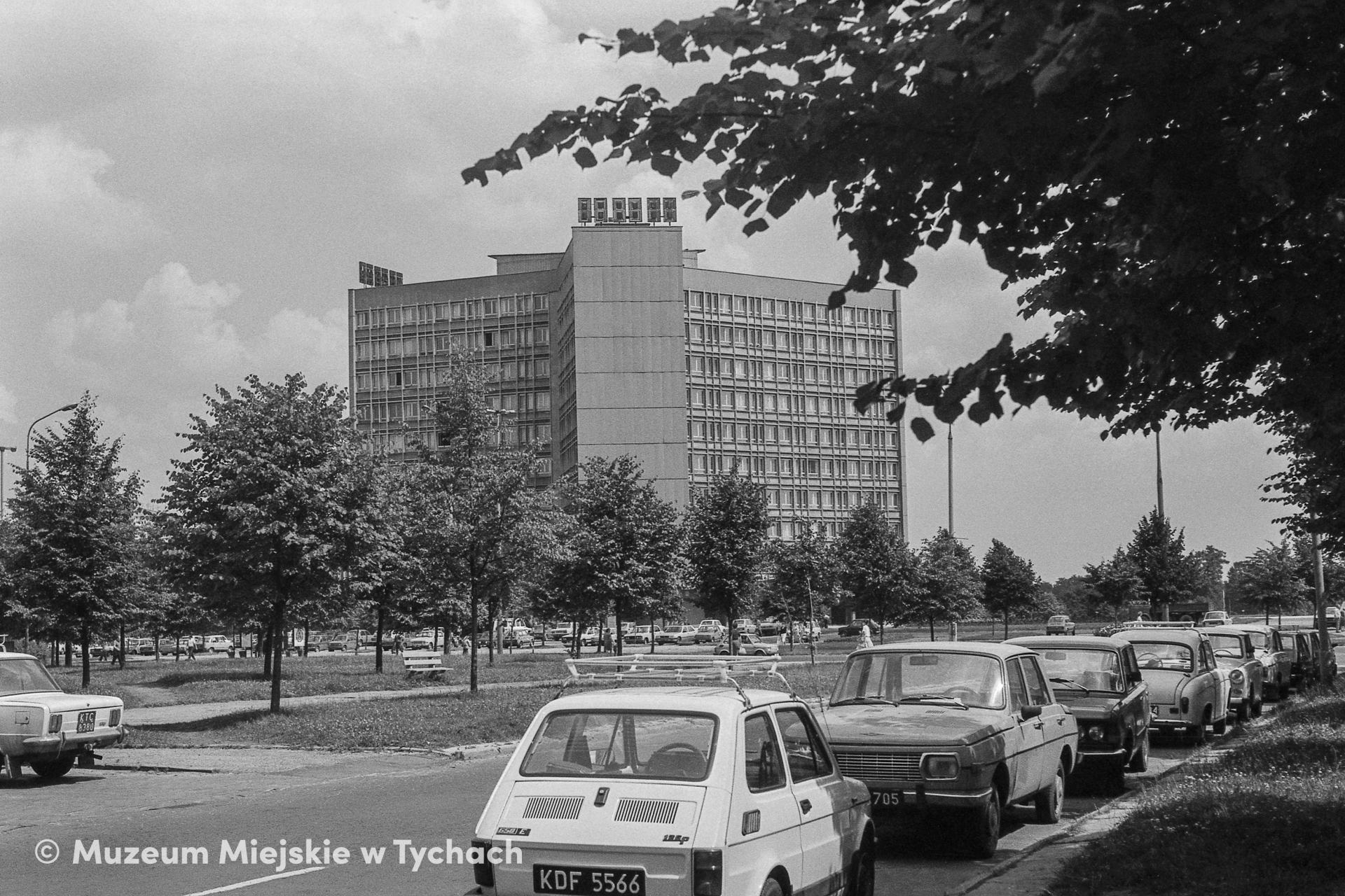 Widok na budynek Prezydium Miejskiej Rady Narodowej w Tychach (obecnie Urząd Miasta Tychy). Na zdjęciu utrwalony także fragment parkingu. Ulica, przy której stoi budynek, pierwotnie nosiła nazwę Paprocańska, od 1968 do 1989 roku aleja Rewolucji Październikowej, dziś aleja Niepodległości.