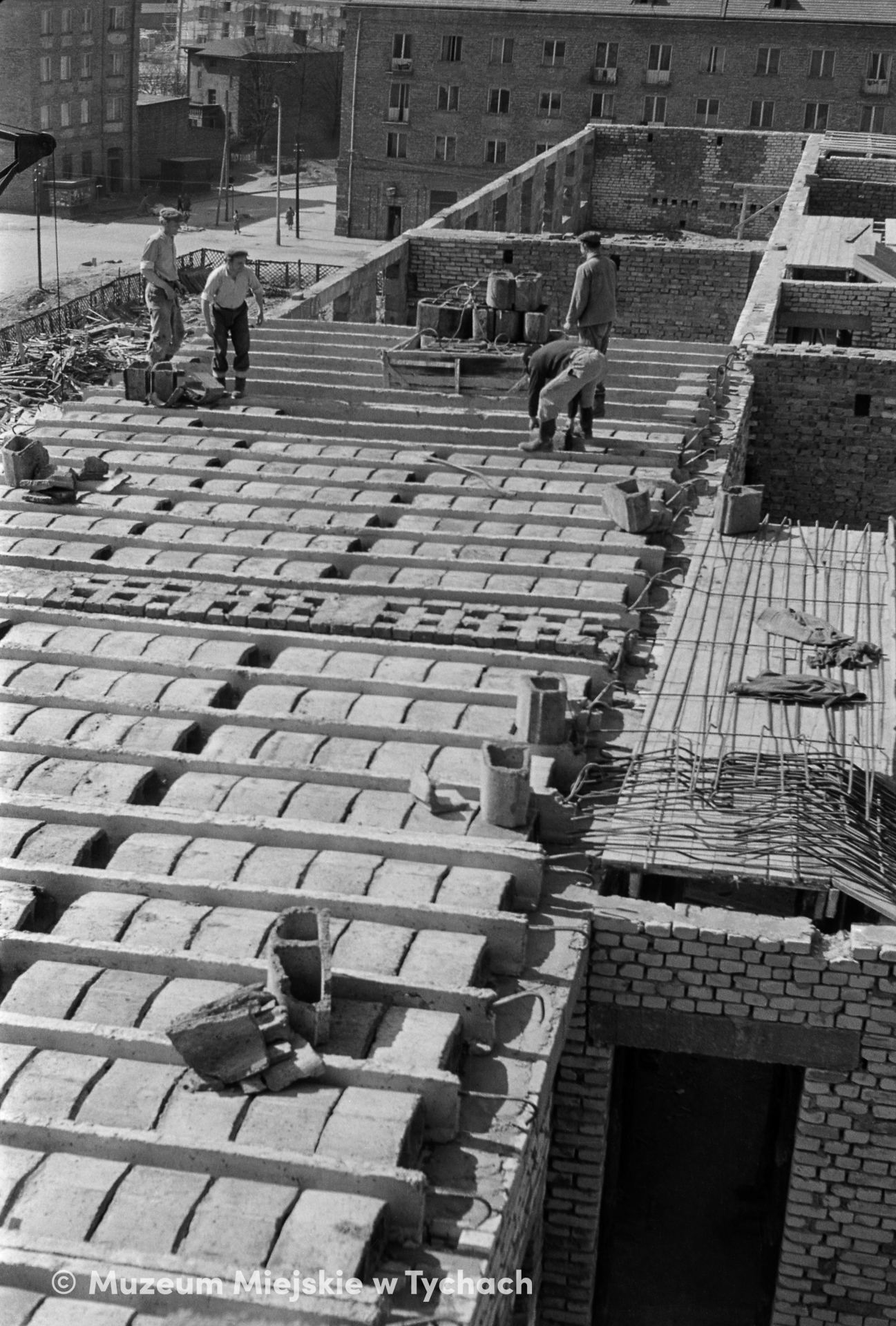 Montaż stropu z pustaków Ackermana na kondygnacji wznoszonego budynku przy placu Bolesława Bieruta (obecnie Krzysztofa Kamila Baczyńskiego).