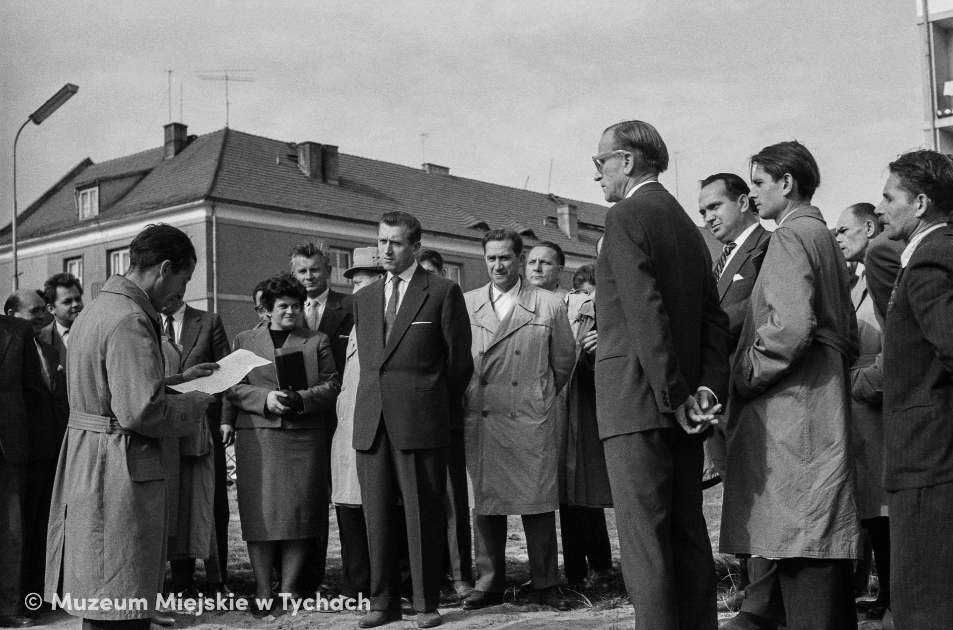 Odczytanie aktu erekcyjnego w czasie uroczystego wmurowania kamienia węgielnego pod budowę budynku mieszkalnego dla pracowników Tyskiego Przedsiębiorstwa Budownictwa Miejskiego. W uroczystości wzięli udział Kazimierz Wejchert, główny projektant miasta, Witalis Barański, dyrektor TPBM, Marian Łatak, dyrektor DBOR, oraz pracownicy i mieszkańcy.