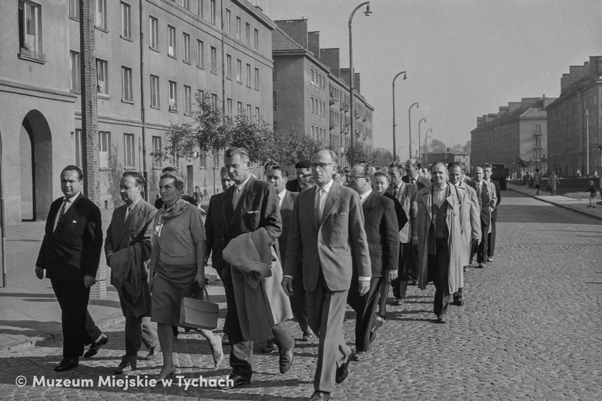 Obchody Dni Budowlanych. Ulicą Budowlanych na uroczystości w kinie Andromeda przy placu Bolesława Bieruta (obecnie Krzysztofa Kamila Baczyńskiego) maszerują robotnicy budowlani i orkiestra. W pierwszym szeregu Witalis Barański, dyrektor TPBM, Hanna Adamczewska-Wejchert i Kazimierz Wejchert, główny projektant miasta, oraz Marian Łatak, dyrektor DBOR. W tle hotel robotniczy „Hotelowiec” i budynki mieszkalne wzdłuż ulicy Budowlanych.
