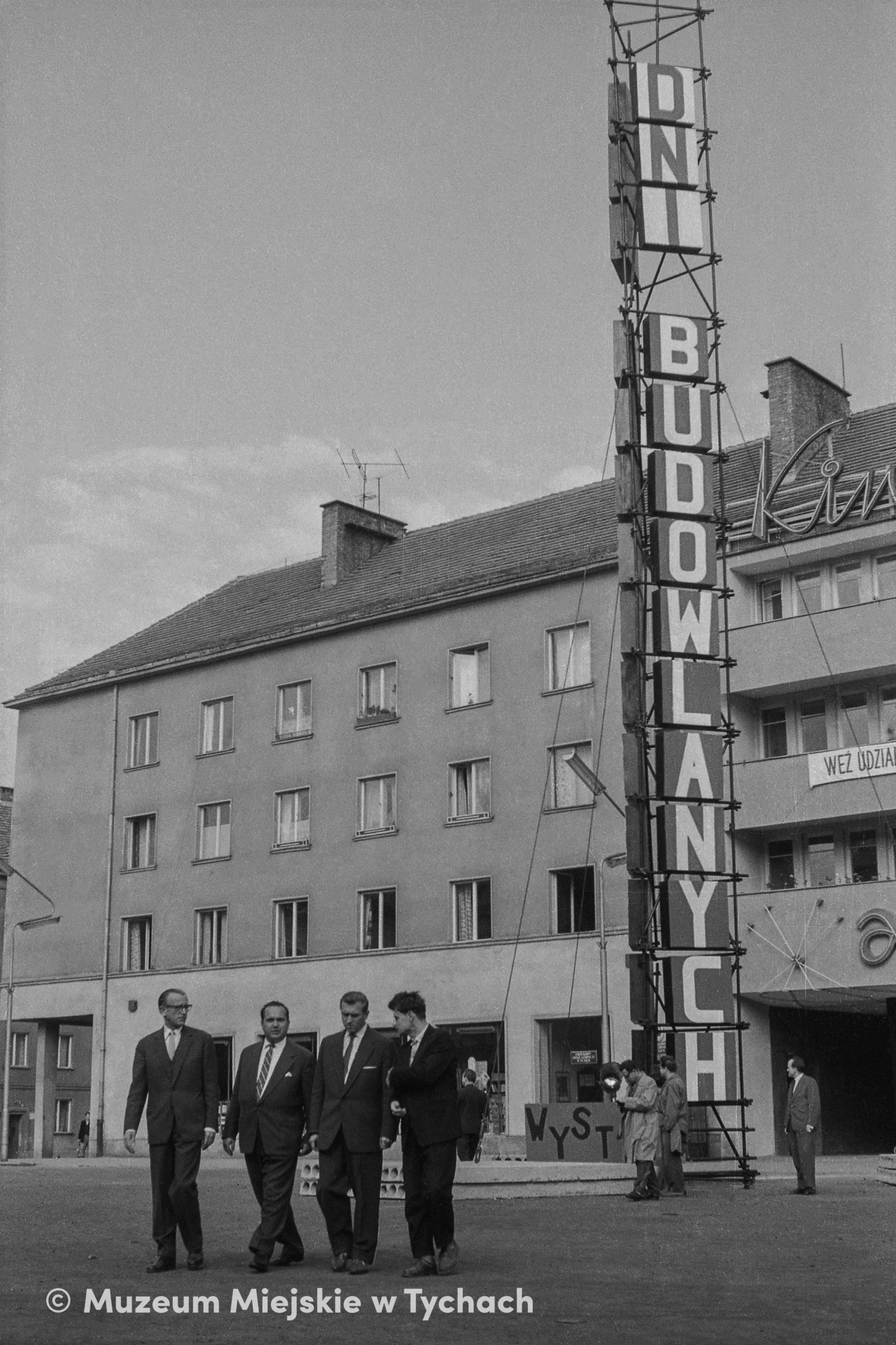Obchody Dni Budowlanych. Marian Łatak, dyrektor DBOR, oraz Witalis Barański, dyrektor TPBM, spacerują w towarzystwie współpracowników po placu Bolesława Bieruta (obecnie Krzysztofa Kamila Baczyńskiego) po zakończeniu oficjalnej uroczystości w kinie Andromeda.