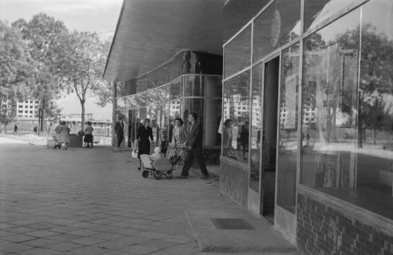 Mieszkańcy spacerują przed przeszkloną elewacją z wejściami do sklepów. W pawilonie handlowym przylegającym do ściany szczytowej budynku mieszkalnego mieściło się przejście prowadzące do ulicy Cyganerii. W wolnej przestrzeni z drugiej strony pawilonu w latach 1965–1966 zostanie wybudowany Miastoprojekt. Widok od północnego zachodu.