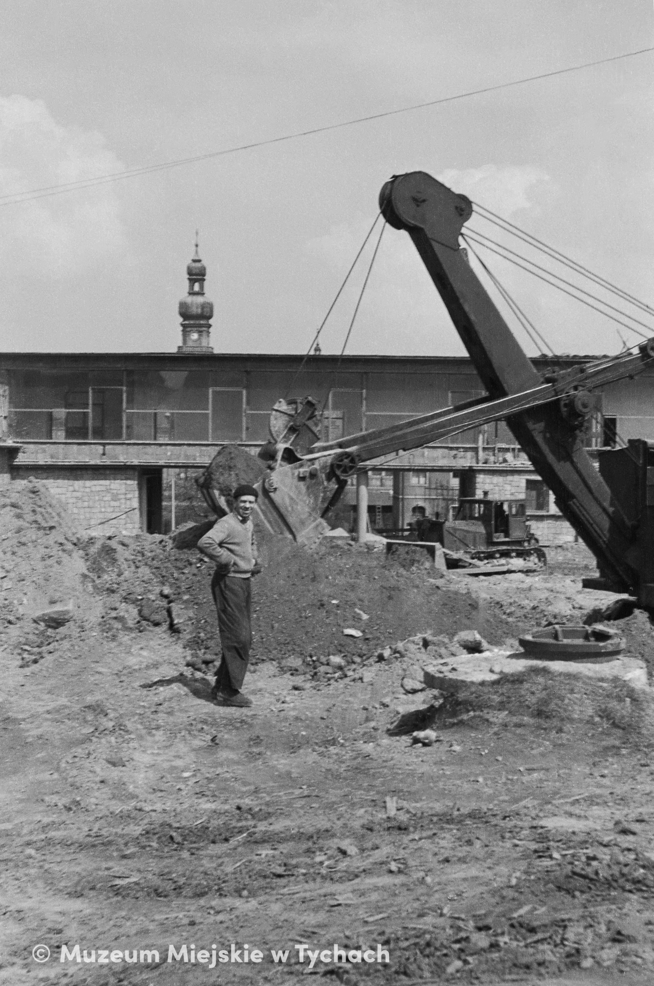Budynki Teatru Małego w stanie surowym, przed nimi teren porządkowanego dziedzińca.