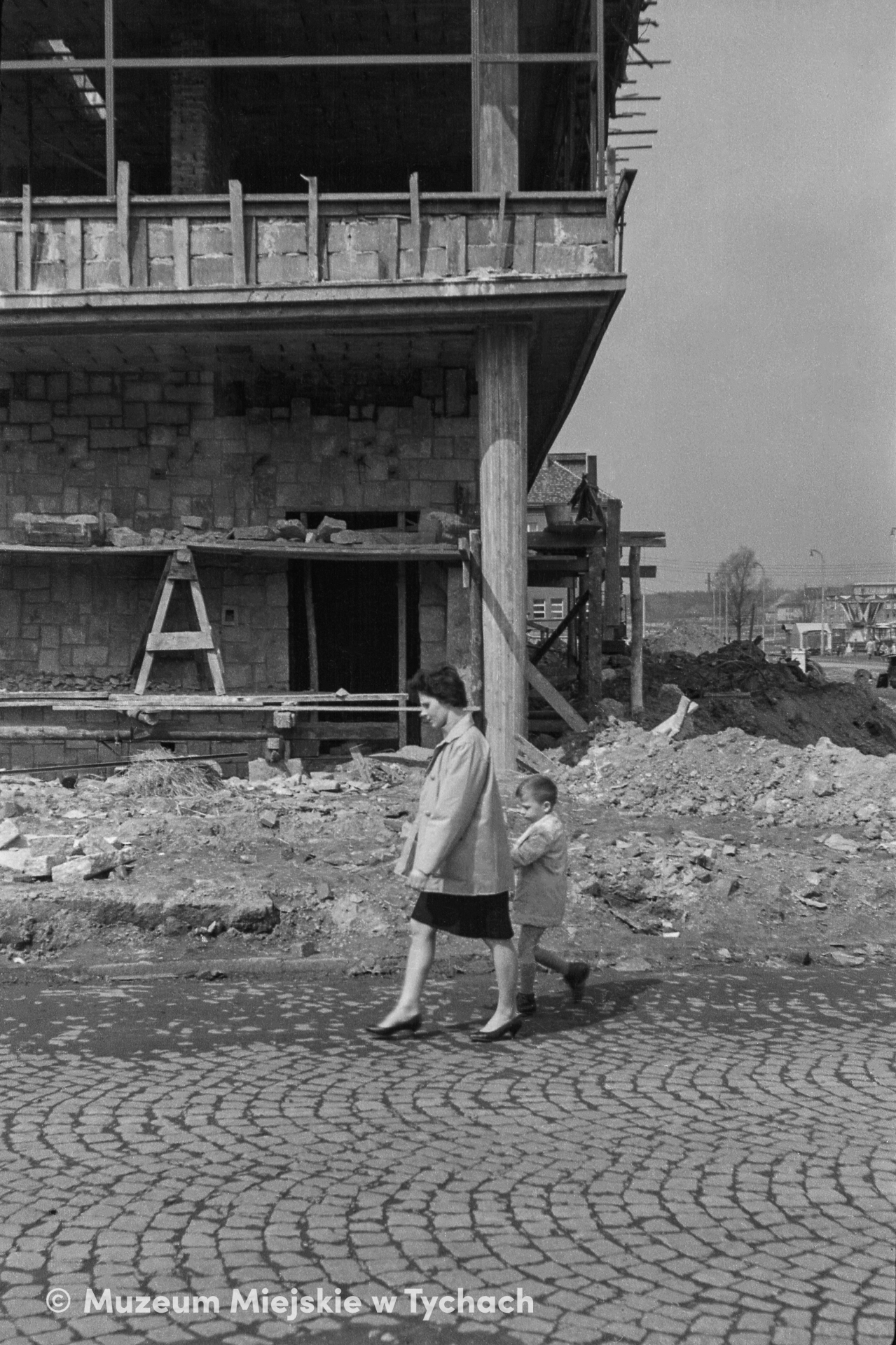 Widok od ulicy Mariana Buczka (obecnie o. Innocentego Bocheńskiego) na budowę Teatru Małego. Przed ścianą z wejściem do przyszłej kawiarni Teatralnej spaceruje kobieta z dzieckiem.