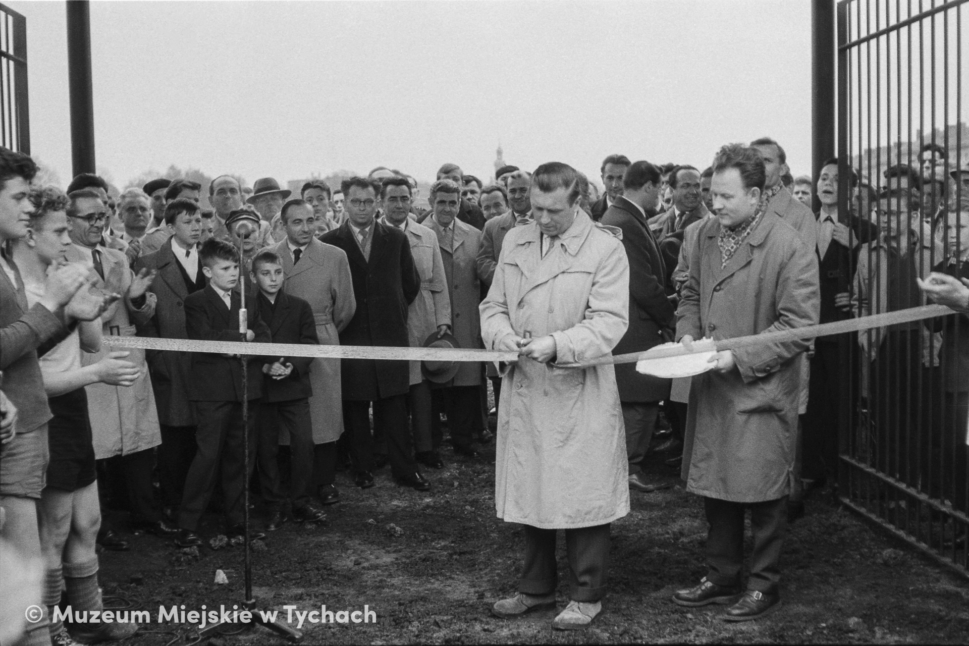 Przecięcie wstęgi w czasie uroczystości oddania do użytku obiektów infrastruktury sportowej na stadionie przy ulicy Włodzimierza Lenina (obecnie gen. Władysława Andersa). W uroczystości brali udział Witalis Barański i pracownicy WPBM, młodzież, nauczyciele wychowania fizycznego i trenerzy.