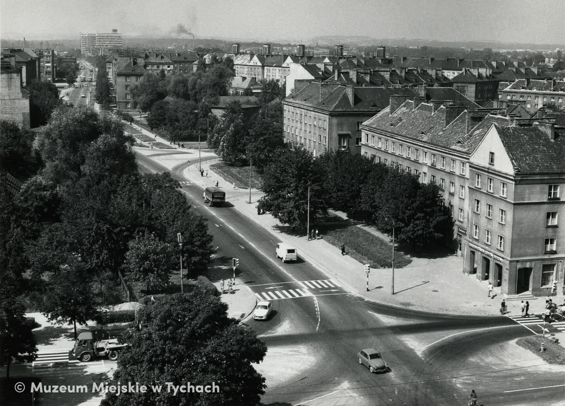 Widok z góry na ulicę Budowlanych. Widoczna zabudowa północnej strony ulicy oraz skrzyżowanie z aleją Bielską i ulicą Fryderyka Engelsa (obecnie Edukacji). W głębi wysokie budynki Zakładu Elektroniki Górniczej.