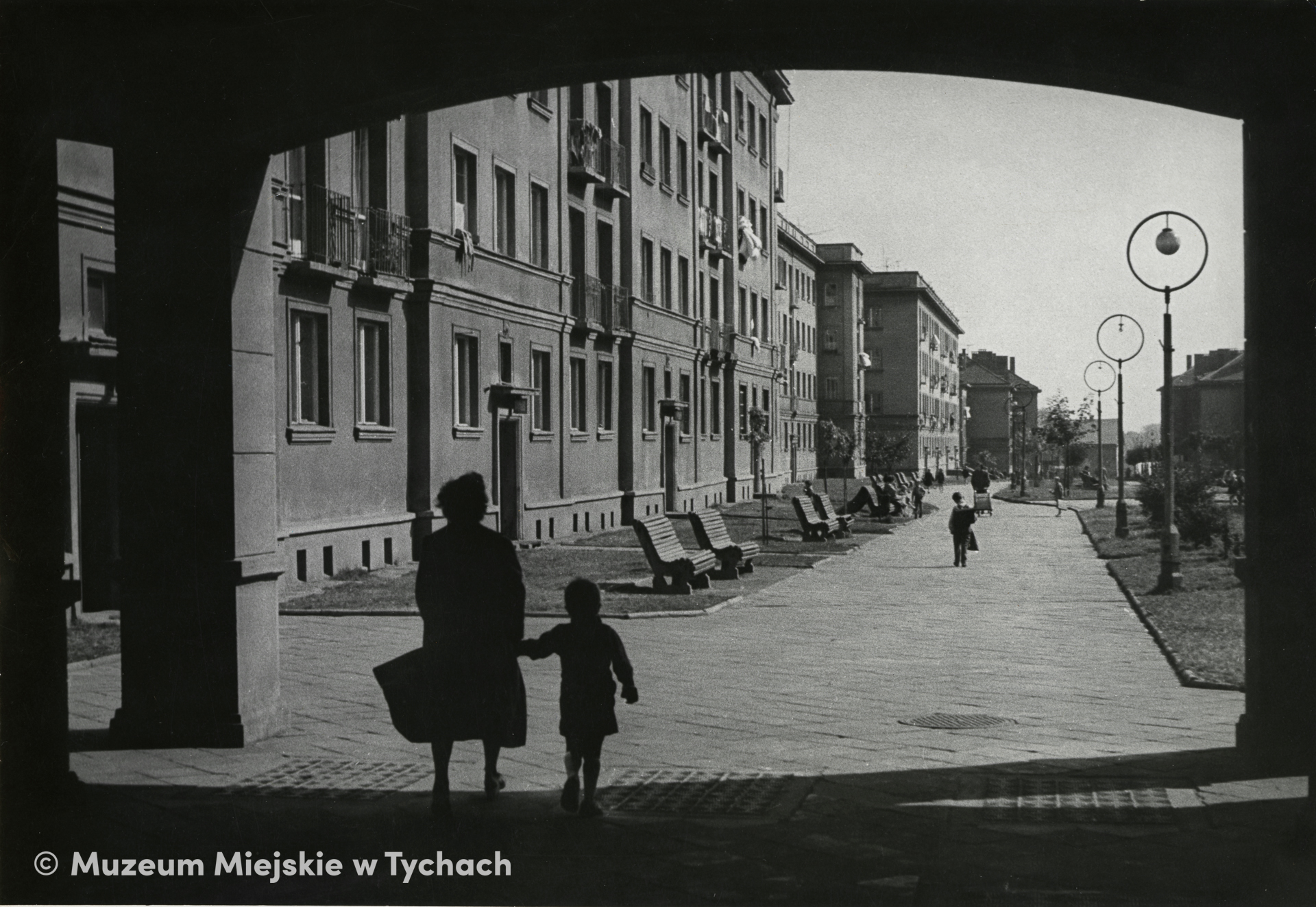 Północna pierzeja ulicy Wincentego Pstrowskiego (obecnie Arkadowej). Widok spod arkad w kierunku osiedla B.