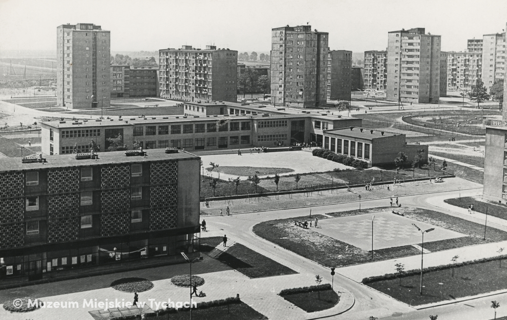 Widok na fragment osiedla D z budynkiem Szkoły Podstawowej nr 13 (obecnie Szkoła Podstawowa nr 13 z Oddziałami Dwujęzycznymi w Tychach).