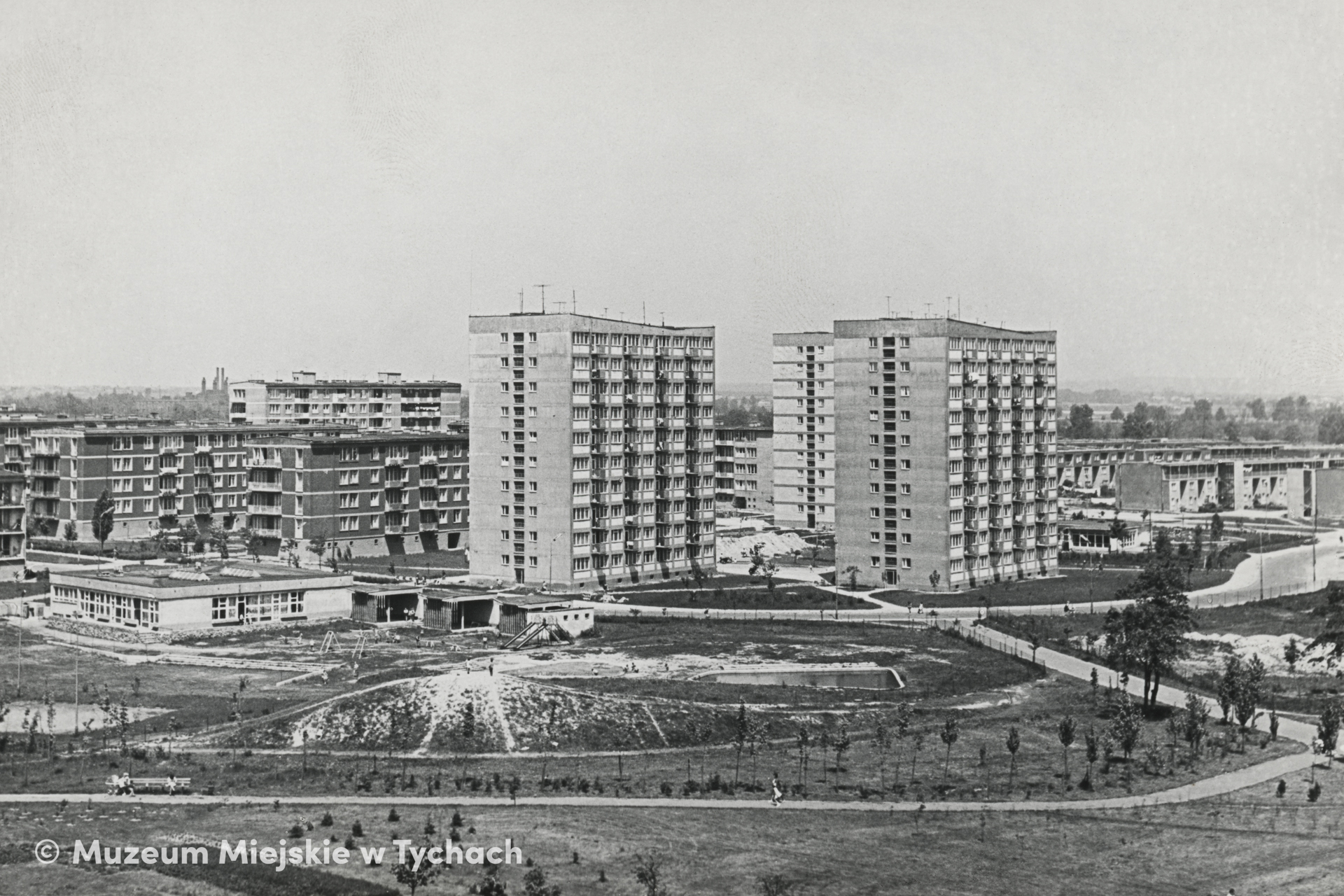 Widok z góry na fragment Parku Miejskiego, ogródek jordanowski przy pawilonie świetlicy dziecięcej (obecnie Młodzieżowy Dom Kultury nr 2) oraz bloki mieszkalne przy ul. Elfów na osiedlu E.