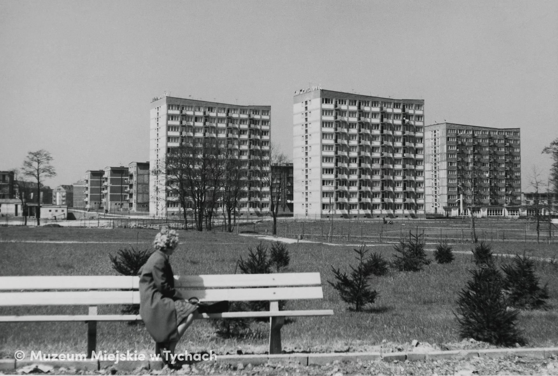 Kobieta siedzi na ławce na terenie przyszłego Parku Miejskiego, zwrócona w stronę budynków mieszkalnych przy ulicy Elfów. Po prawej stronie fragment budynku przedszkola.