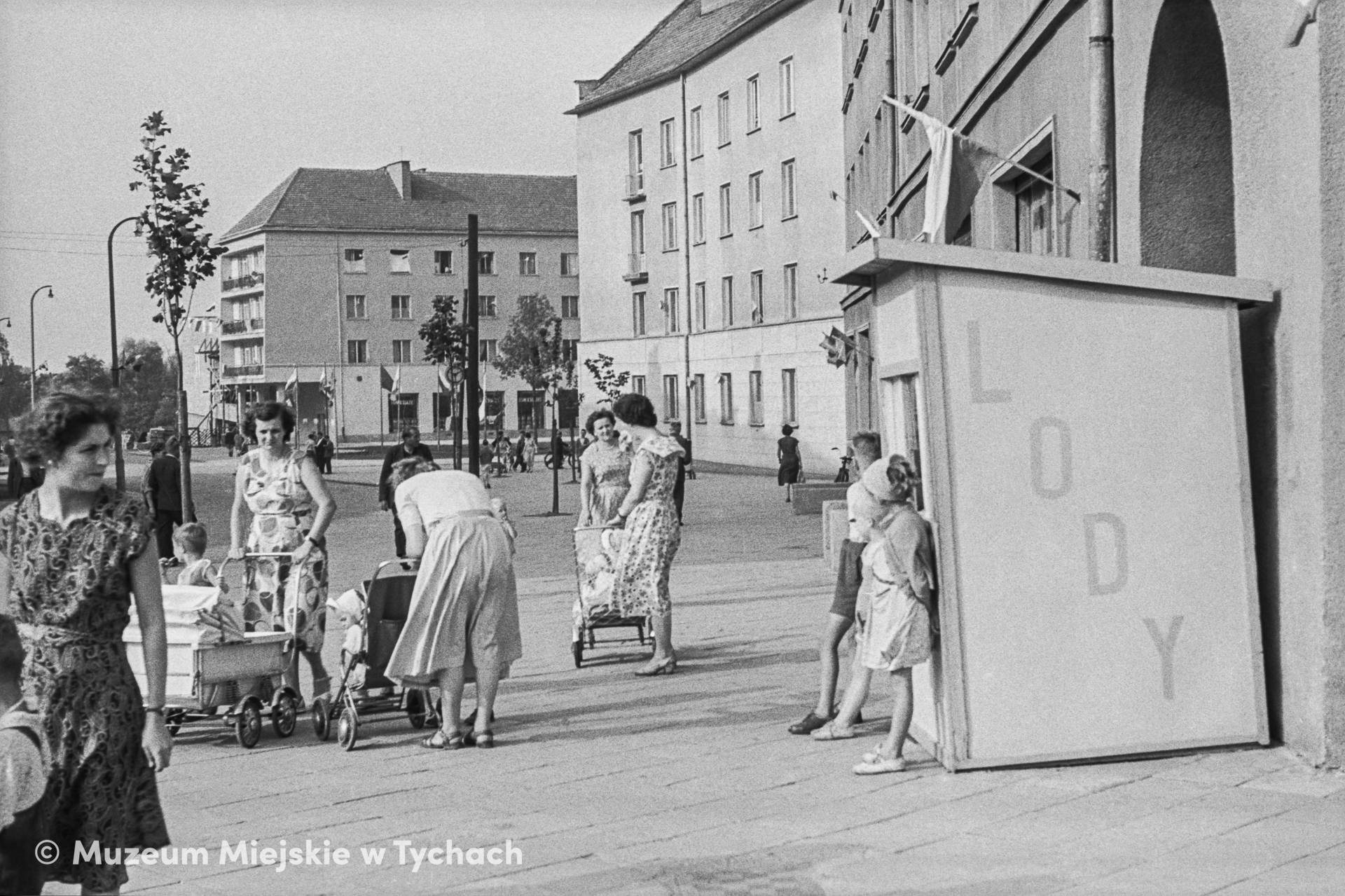 Kobiety i dzieci przed budką z lodami Bambino przy ulicy Mariana Buczka (obecnie o. Innocentego Bocheńskiego). W głębi budynek mieszkalny przy placu Bolesława Bieruta (obecnie Krzysztofa Kamila Baczyńskiego).
