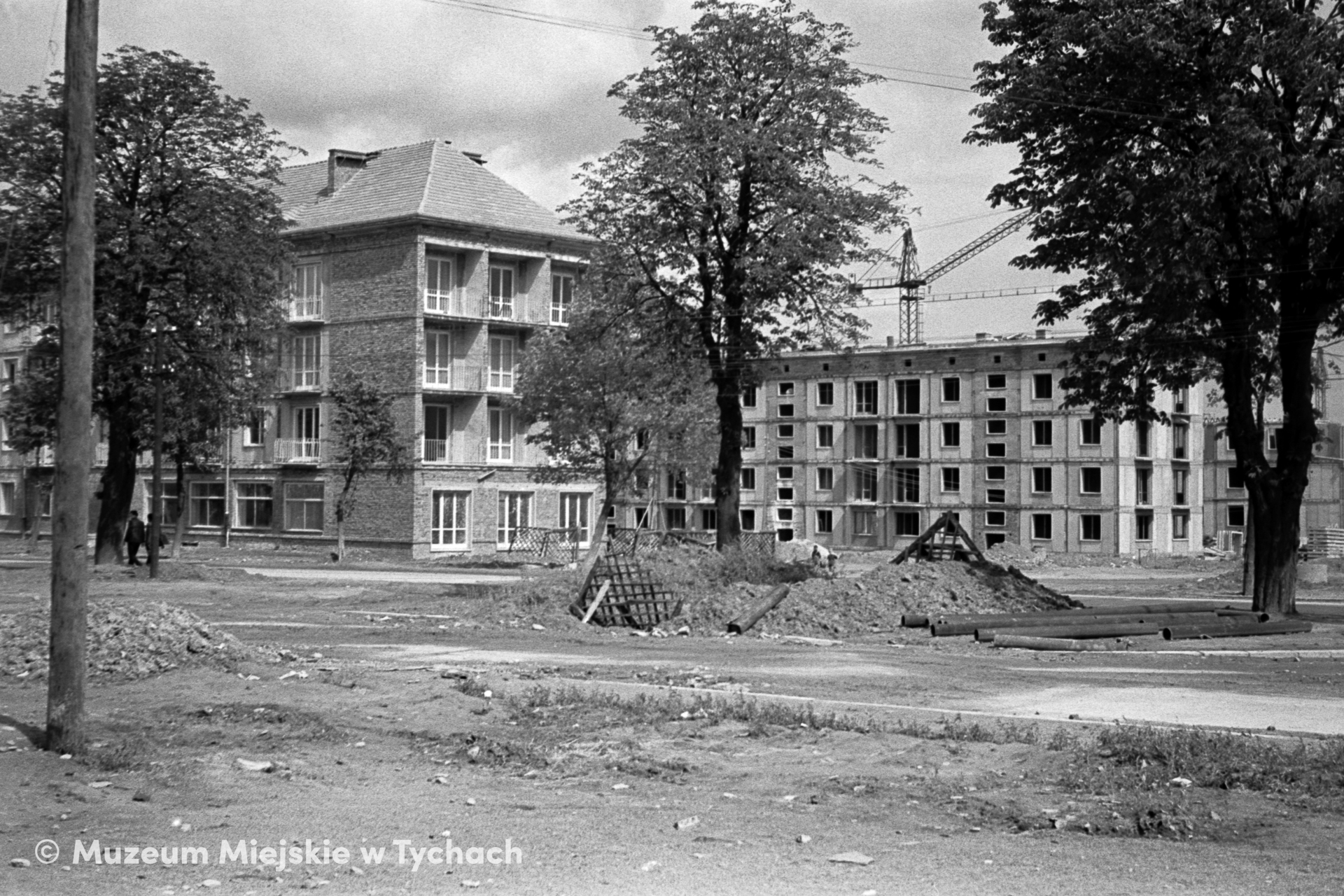 Budynek mieszkalny na rogu alei Bielskiej i ulicy Cyganerii. W głębi wznoszone budynki mieszkalne przy ulicy Ciasnej.