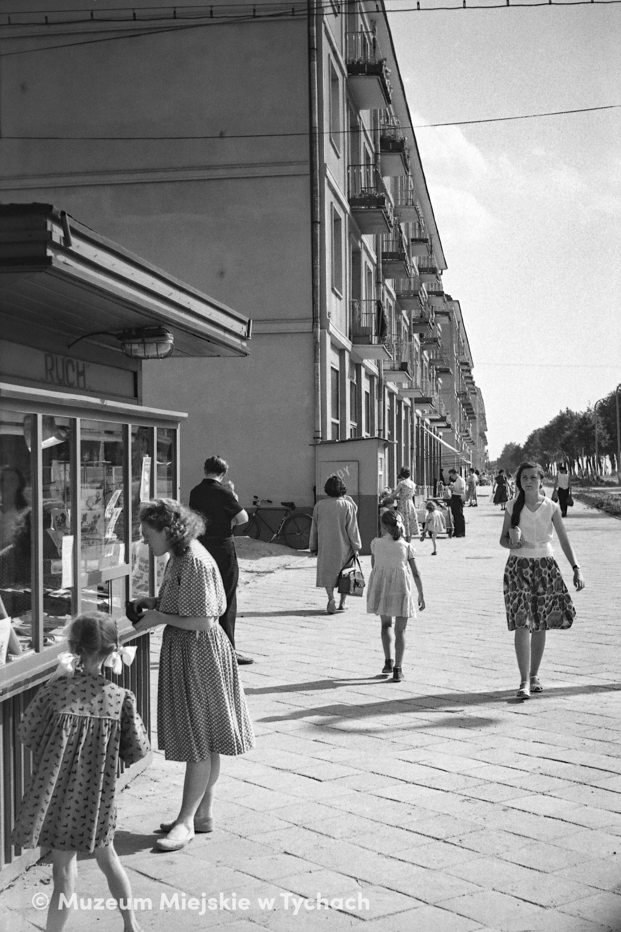 Mieszkańcy przed sklepami ulokowanymi w parterowej części budynków mieszkalnych wzdłuż alei Bielskiej. Przy kiosku Ruchu stoi matka z córką.