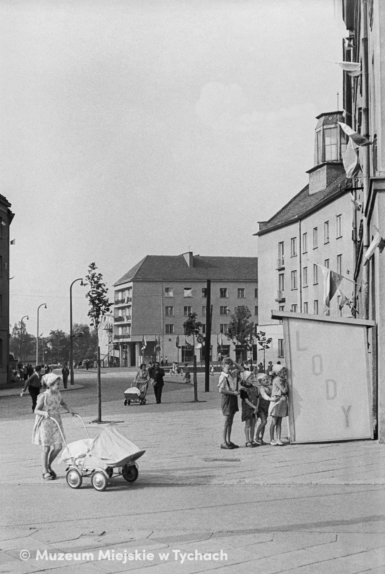 Dzieci w kolejce do budki z lodami Bambino przy ulicy Mariana Buczka (obecnie o. Innocentego Bocheńskiego). W głębi budynek mieszkalny przy placu Bolesława Bieruta (obecnie Krzysztofa Kamila Baczyńskiego).