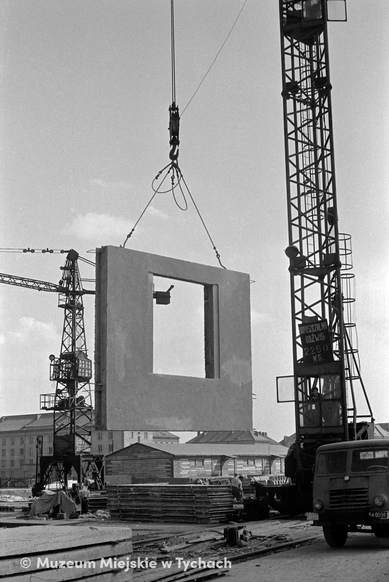 Żurawie w trakcie załadunku prefabrykowanej płyty ściennej na samochód ciężarowy Star 20. Zdjęcie wykonane na terenie zakładu prefabrykacji. W głębi budynek Prezydium Miejskiej Rady Narodowej.
