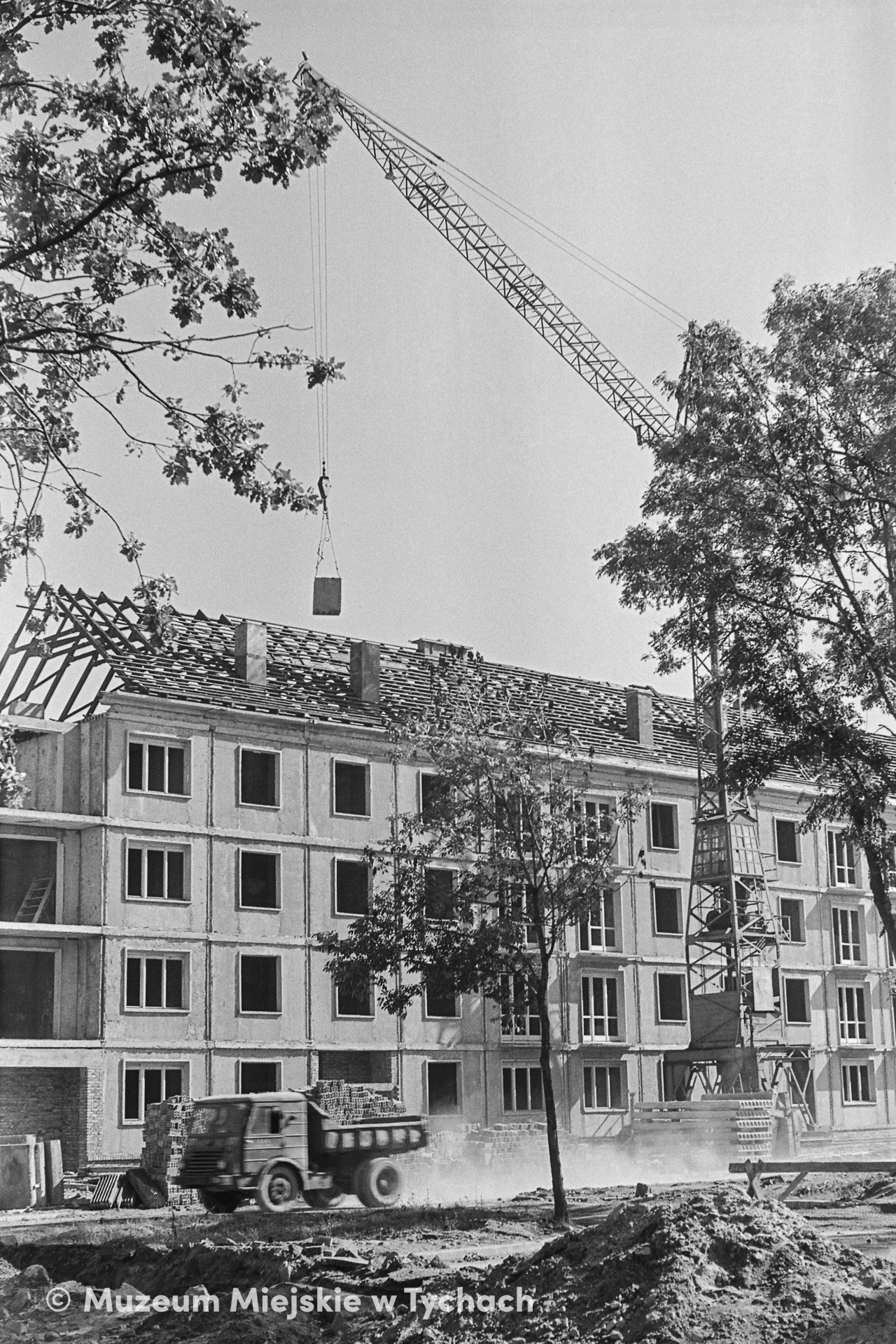 Montaż prefabrykowanych elementów kominowych na konstrukcji nośnej dachu budynku mieszkalnego. Budynek ma ściany zewnętrzne z płyt prefabrykowanych z ramą okienną, a ściany poprzeczne (wewnętrzne) z cegły.