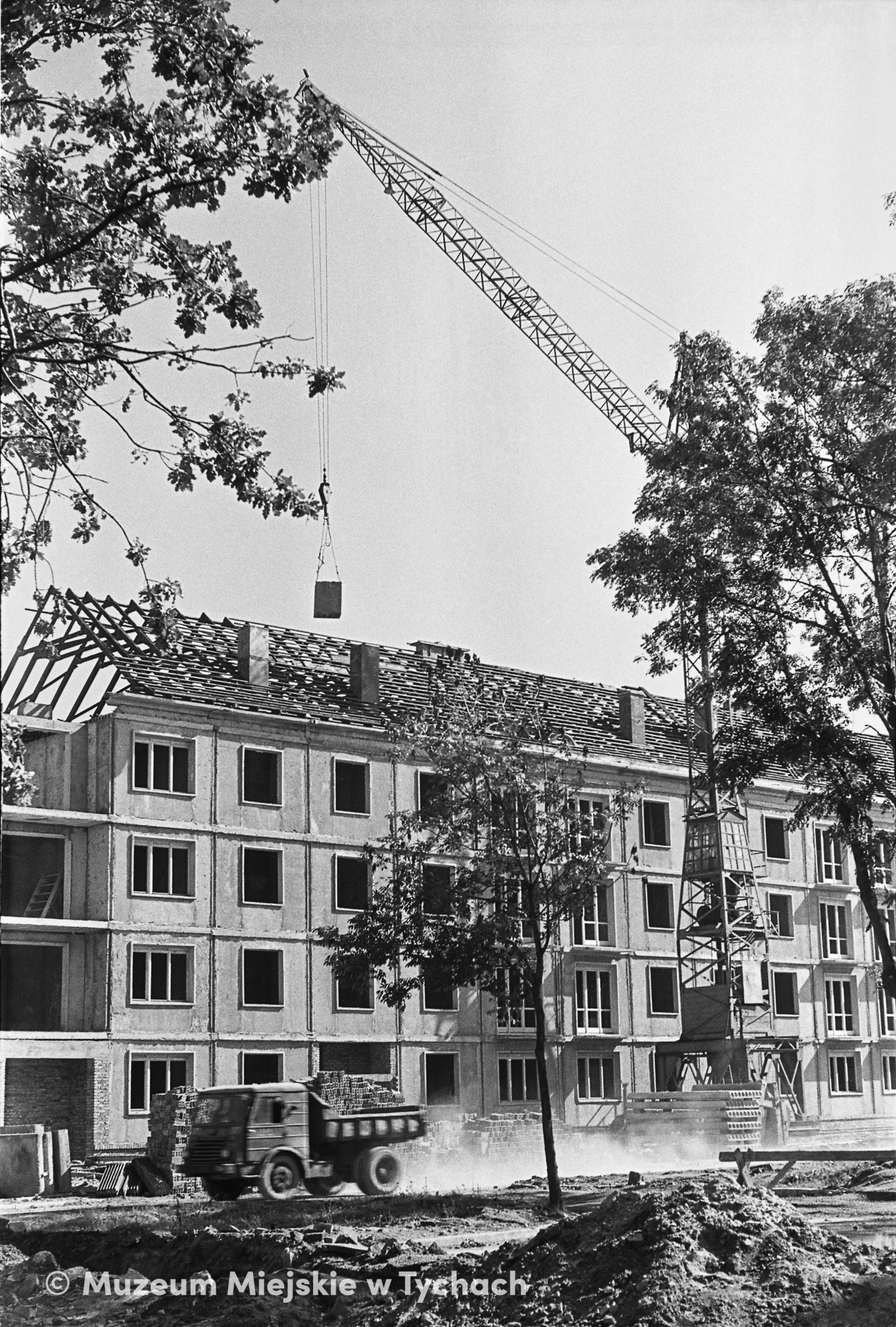 Montaż prefabrykowanych elementów kominowych na konstrukcji nośnej dachu budynku mieszkalnego. Budynek ma ściany zewnętrzne z płyt prefabrykowanych z ramą okienną, a ściany poprzeczne (wewnętrzne) z cegły.