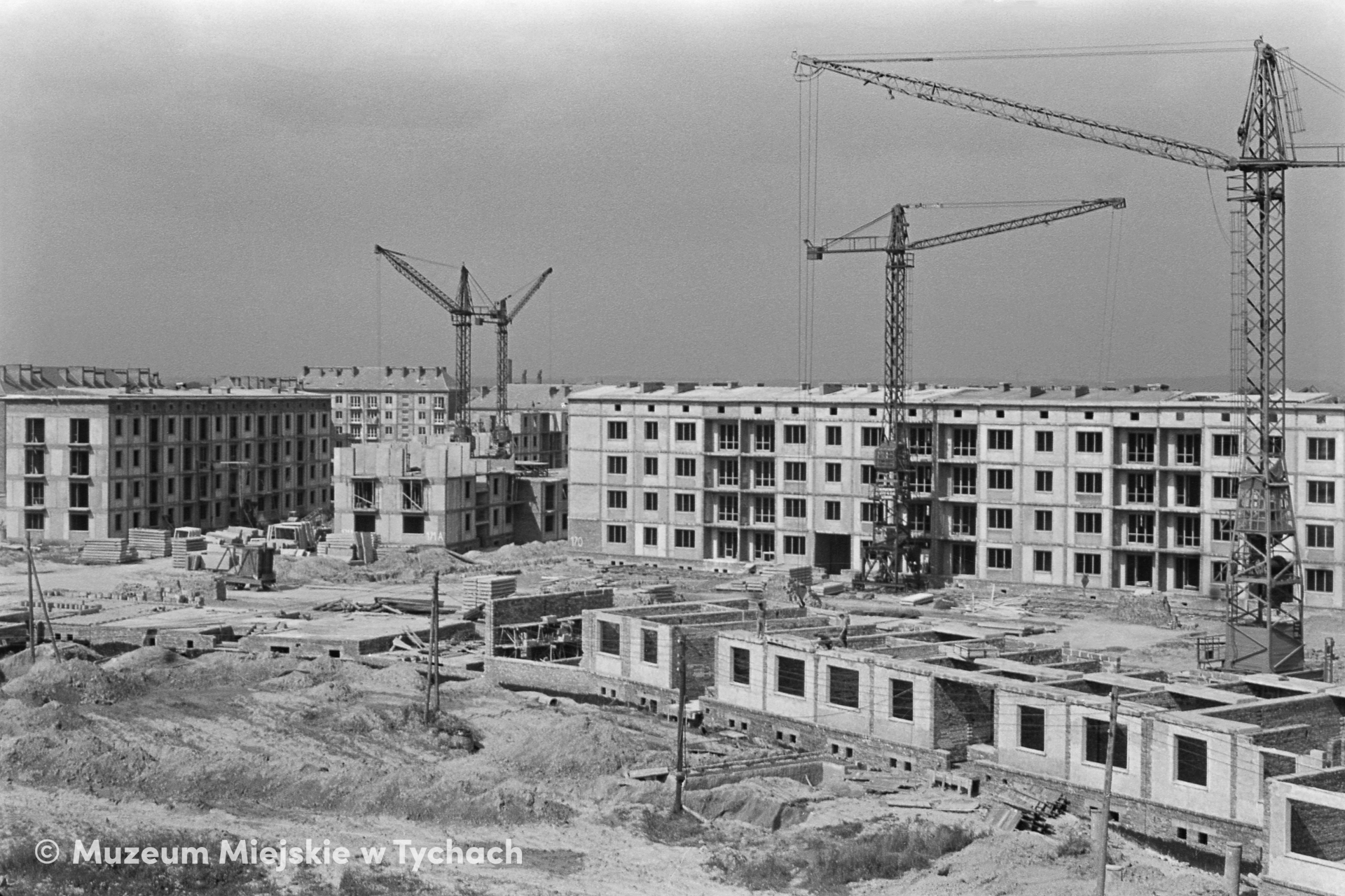 Budynki mieszkalne wznoszone przy przyszłej ulicy Cyganerii i ulicy Ciasnej. Na pierwszym planie montaż kondygnacji parteru i pierwszego piętra budynku mieszkalnego przy ulicy Cyganerii 14–22 oraz prace wykończeniowe przy bloku 170, współcześnie budynku mieszkalnym przy ulicy Cyganerii 3–9.