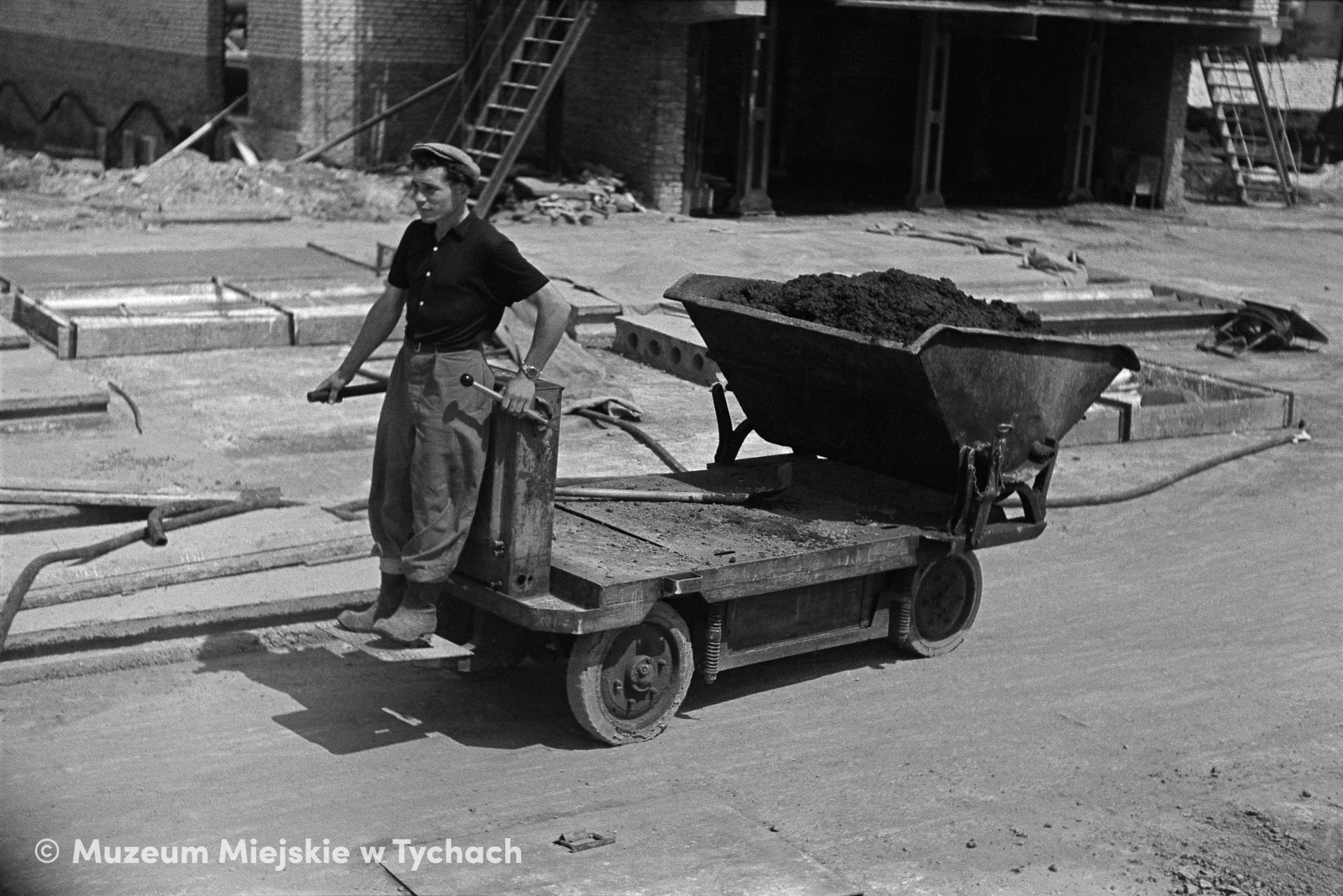 Budowlaniec przewozi wózkiem transportowym masę betonową na stanowisko produkcji elementów prefabrykowanych. Zdjęcie wykonane na terenie zakładu prefabrykacji.