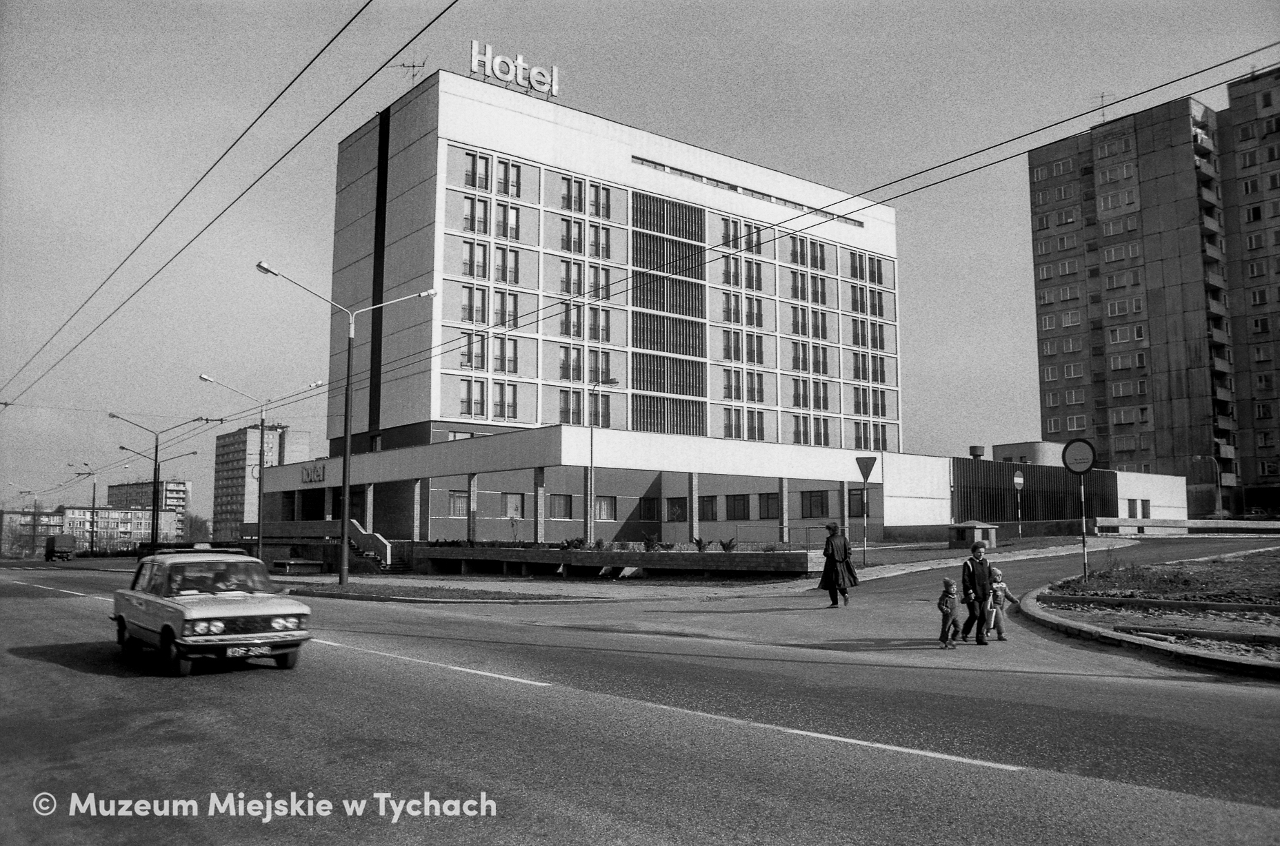 Hotel Tychy przy ulicy Janka Krasickiego (obecnie Jana Pawła II). Widok od ulicy Aleksandra Zawadzkiego (obecnie Romana Dmowskiego). Zdjęcie wykonane w kwietniu 1987.