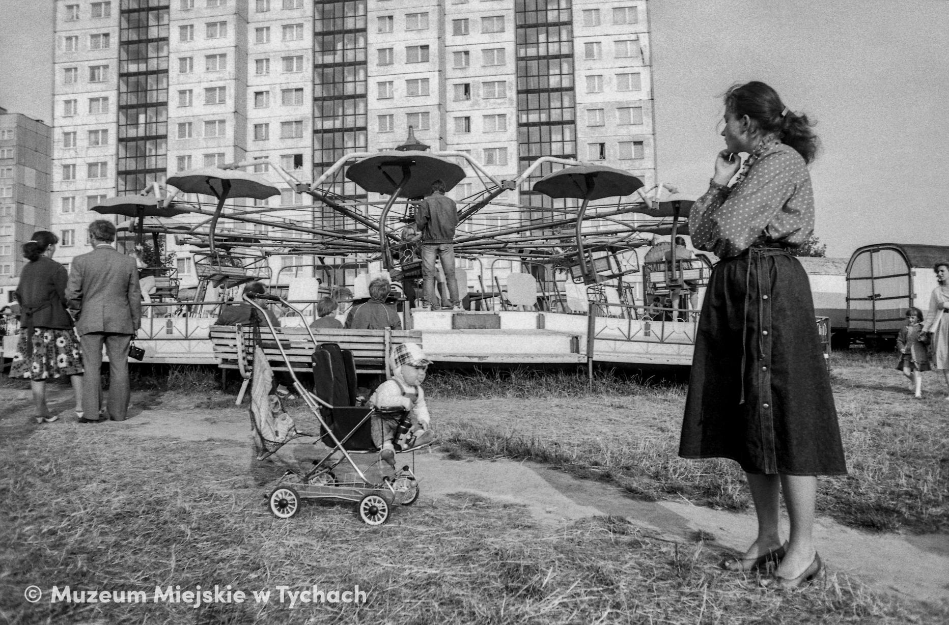 Wesołe miasteczko zorganizowane na terenie osiedla N, w pobliżu ulic Aleksandra Zawadzkiego (obecnie Romana Dmowskiego) i Zofii Nałkowskiej. Pusta karuzela gotowa na przyjęcie pasażerów. W głębi budynek mieszkalny.