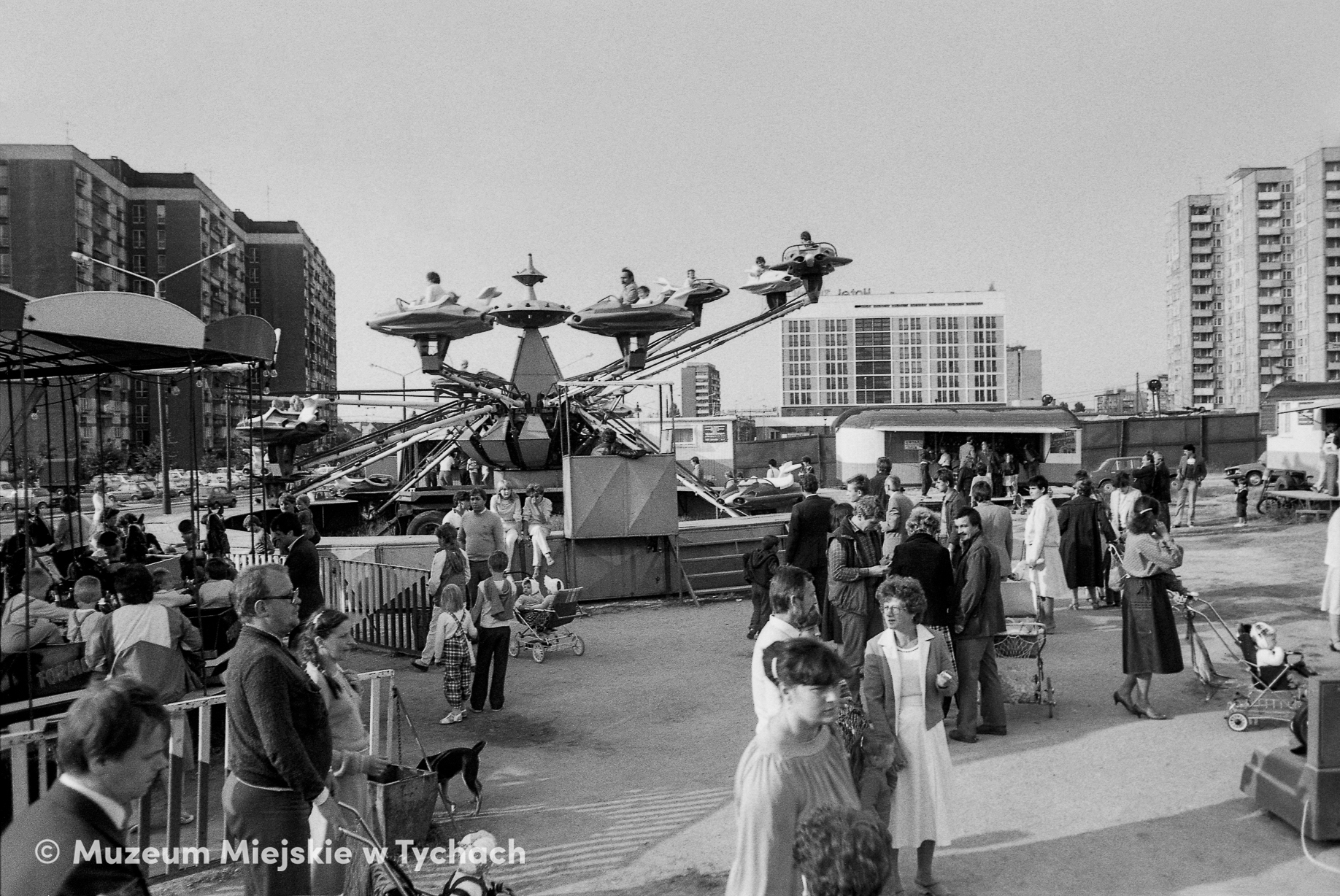Wesołe miasteczko zorganizowane na terenie osiedla N, w pobliżu ulic Aleksandra Zawadzkiego (obecnie Romana Dmowskiego) i Zofii Nałkowskiej. Na karuzelach dzieci z opiekunami. W głębi Hotel Tychy i budynki mieszkalne.