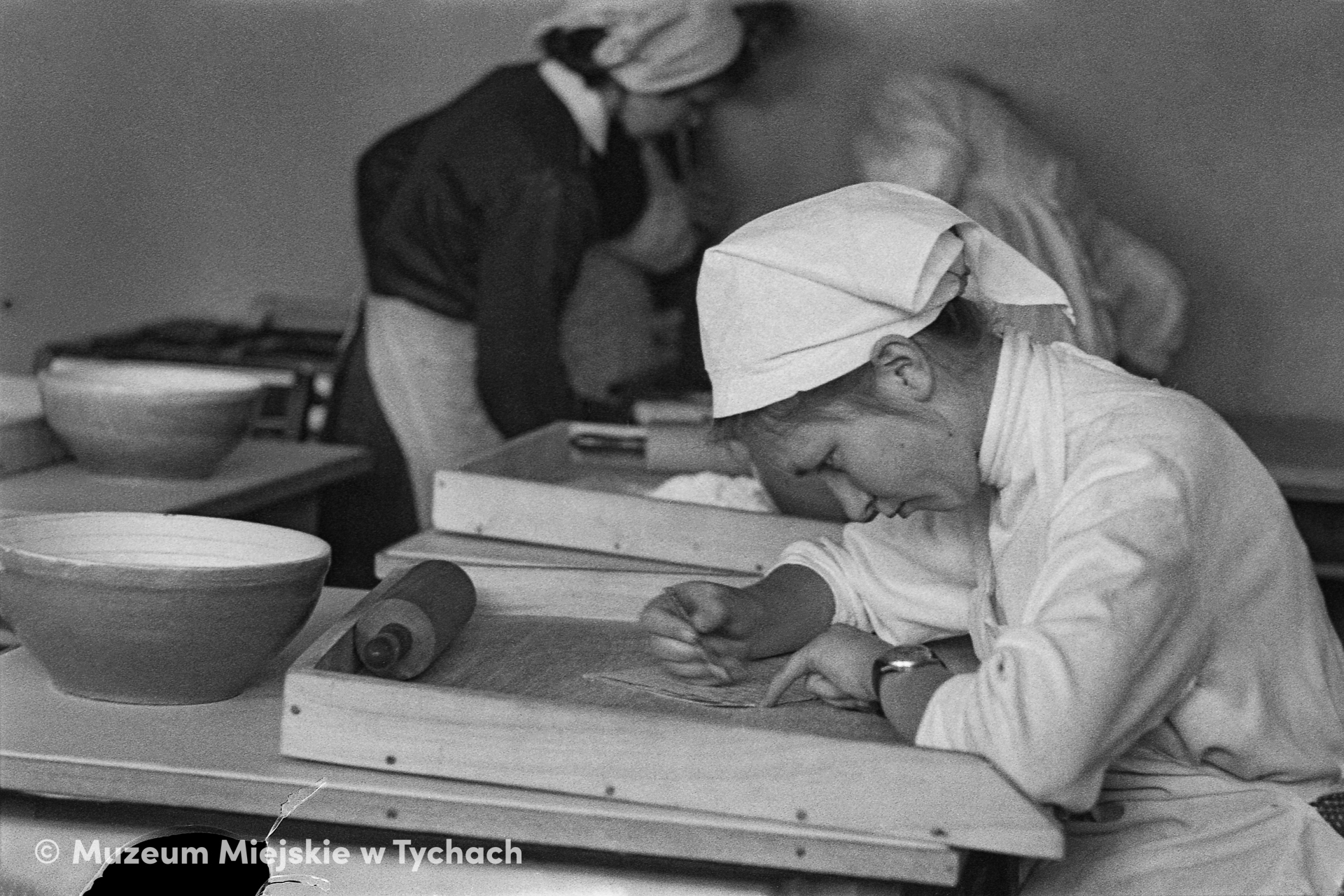 A student of the Vocational School of Home Economics at the Secondary School of Brewing Technology reads a recipe at a pastry board. Cooking and baking classes.