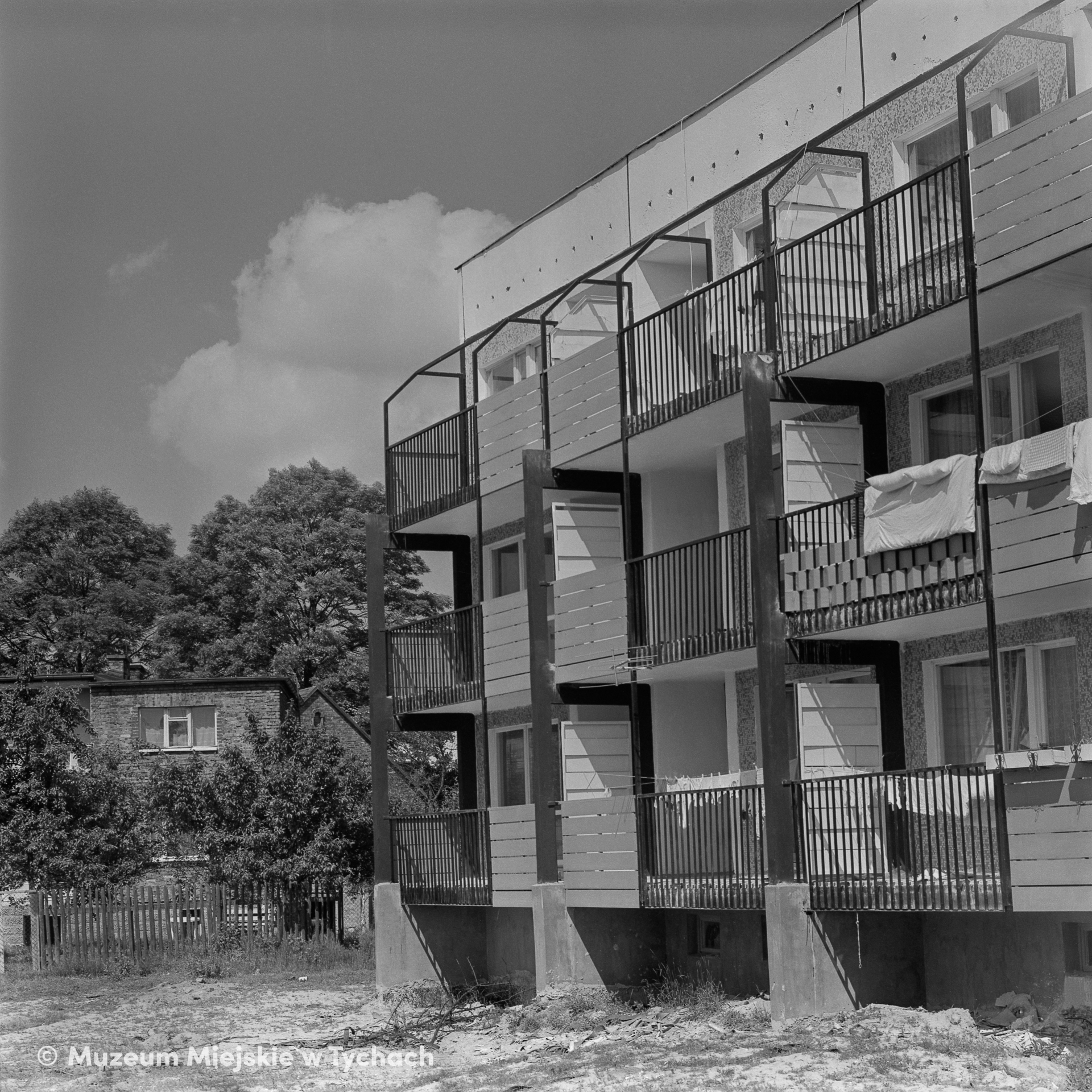 A fragment of a two-storey residential building in Housing Estate W, behind which old rural buildings can be seen.