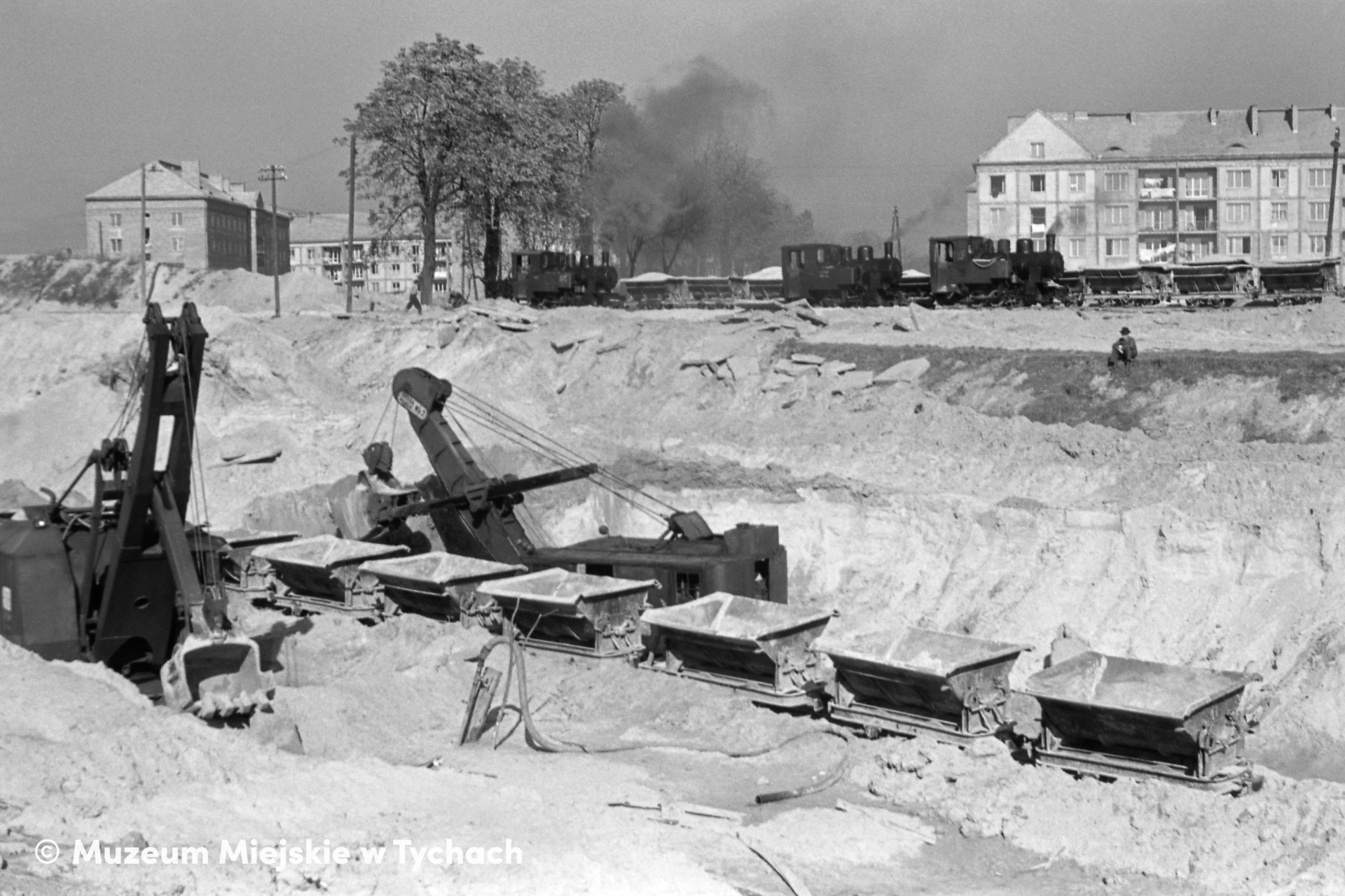 A southeast view of the construction site of a railway trench. The excavator loads the ground from an excavation marked out along Housing Cstate C onto narrow-gauge railway wagons. The buildings in the background are residential blocks near Bielska Avenue and Czysta Street.