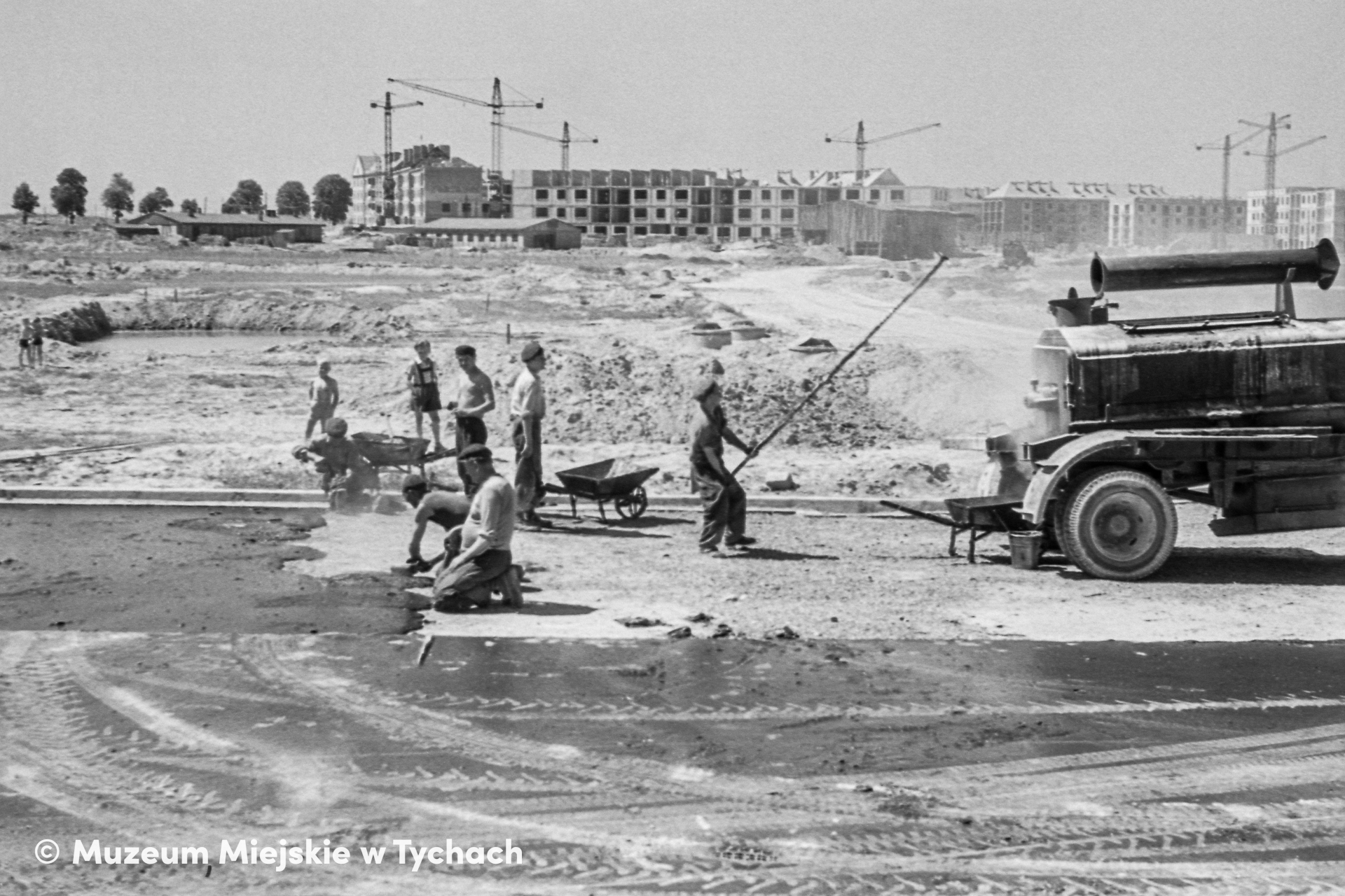 Manual laying of tarmac on the marked out road, the future Feliksa Dzierżynskiego Street (now gen. Stefana Grota Roweckiego Street). Visible in the background buildings under construction in Housing Estate C near the planned Cyganerii Street. A south-east view.