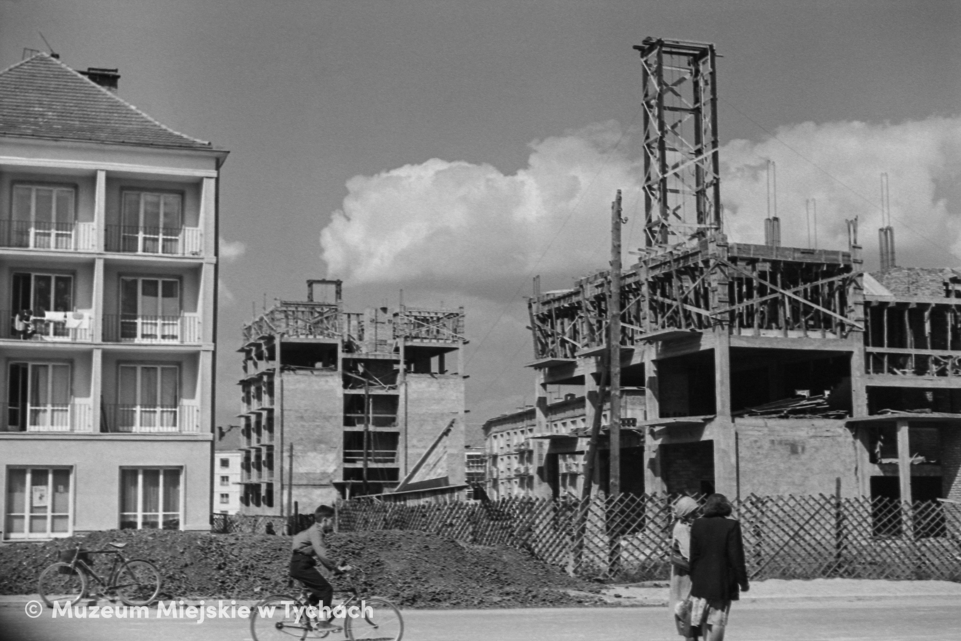 The gable wall of the residential building with Słoneczna Restaurant on the ground floor; on the right, the construction of single-staircase blocks near Cyganerii Street is underway. A view from the southwest.